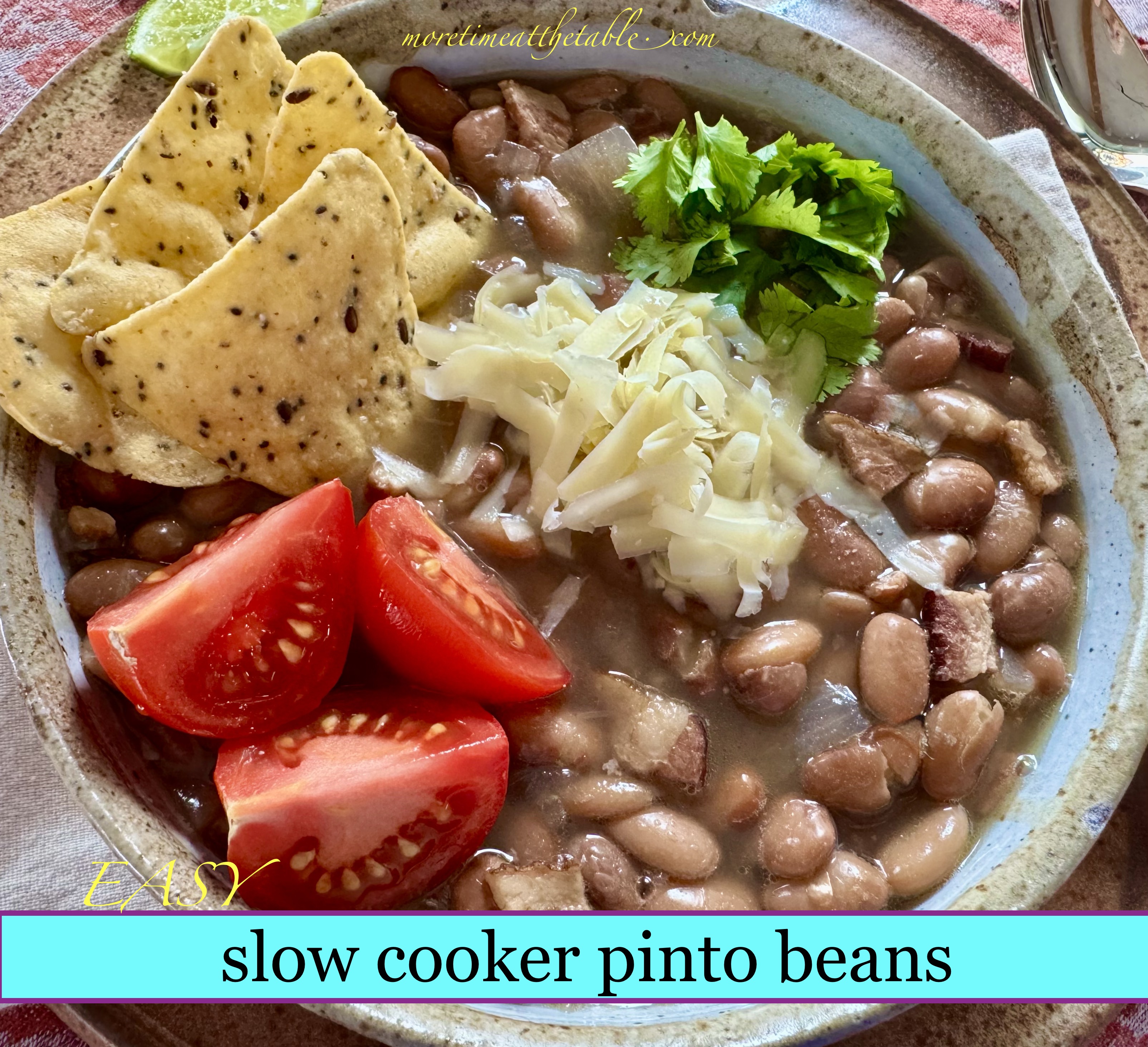 I make pinto beans once a month or so for dinner. We eat a big bowl with cornbread and then freeze the rest in small containers to serve with tacos or thaw for a quick weekday lunch. I have little against canned beans and keep them in my cabinet year round —LOVE CHILI!!–but homemade beans are such a major step up. They’re cheaper, too, (about half the price) and less full of the dreaded sodium. I do cook them on the stovetop or in the Instant Pot but the slow cooker might be my favorite method. There’s something about getting things done early and not worrying about them the rest of the day. Something about walking into the house during the day and the sweet fragrance hitting you in the face, letting you know, “Dinner’s coming.” Something about something bubbling away on the countertop while you do whatever it is you want to do. Slow cooker food sort of spells, “freedom” to this cook.