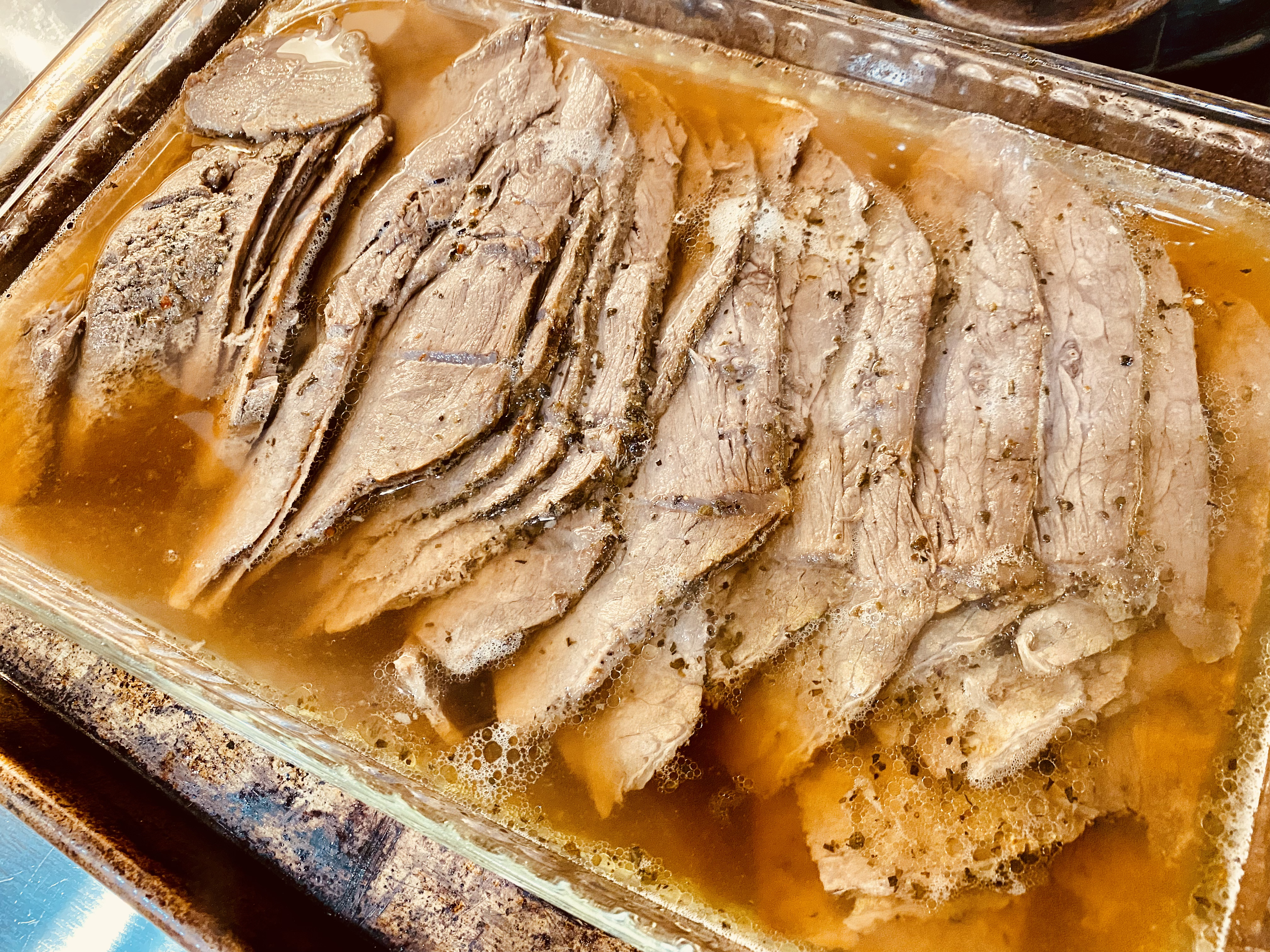 To eat later (best because the flavors marry overnight and you can slice cold meat more easily): Cool meat in strained broth; ; store in frig. Slice cold beef very thinly and return to covered pot. Re-heat gently in oven at 350 F for 30-40 min.