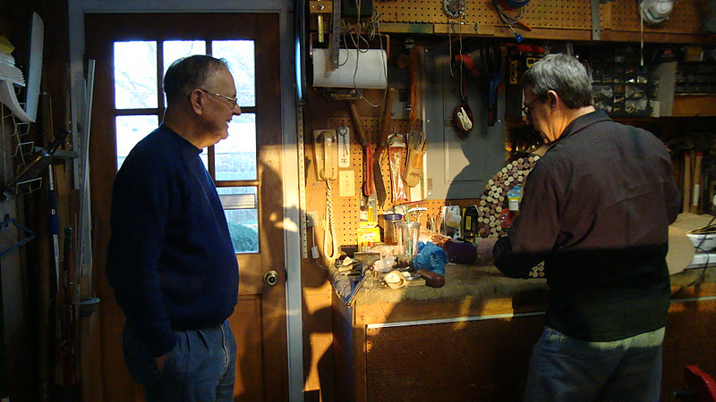 | Making a wine cork wreath in the garage. |