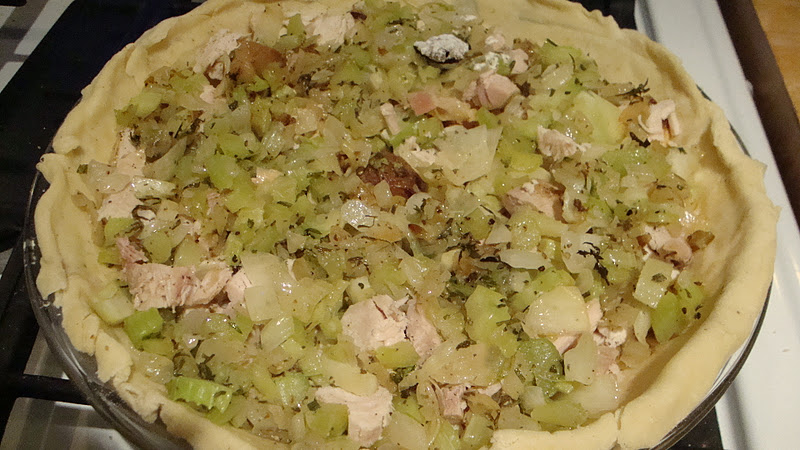 3. Take out pie pan with bottom crust and spoon onion mixture evenly over the bottom of the dough. Top with chopped vegetables and turkey.
