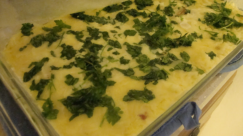 7. Place pie on rack and cool 15 minutes or so. Slice and serve hot with broccolini (squeeze lemon on top) and cranberry sauce.