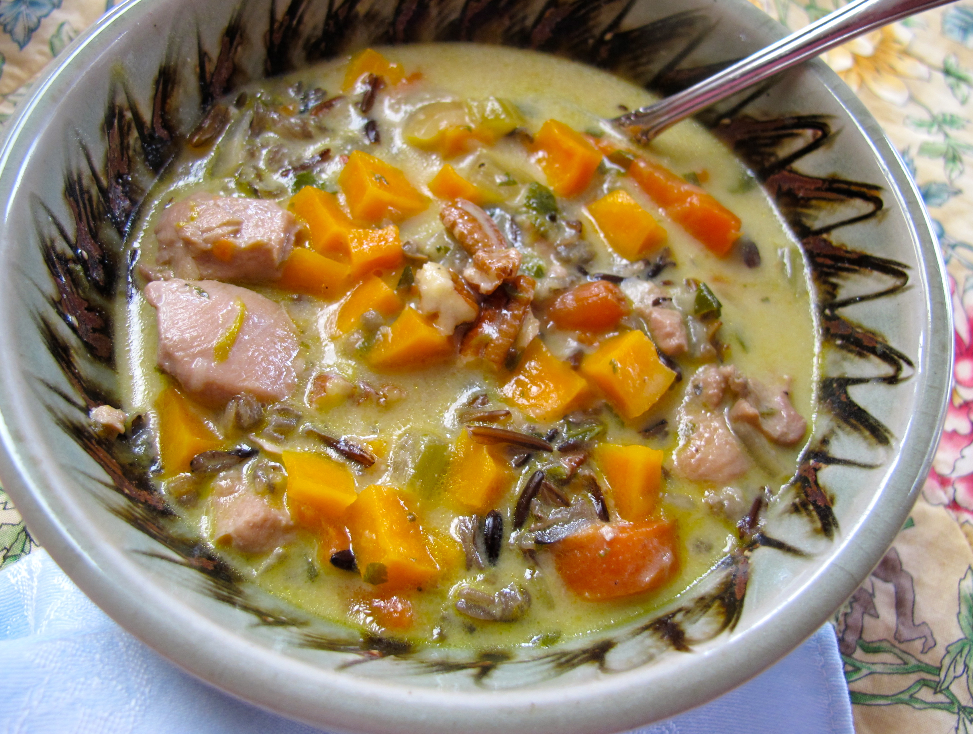chicken-wild rice soup with butternut squash and pecans
