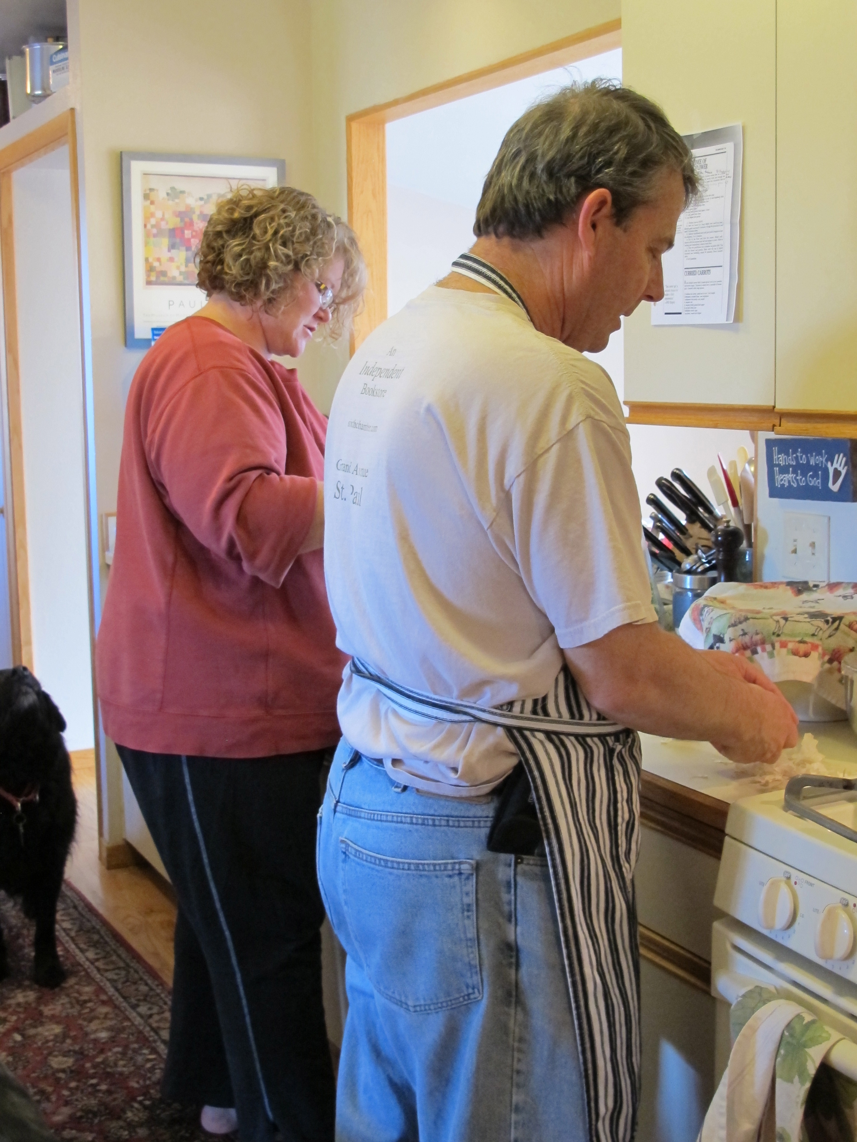 (below: Jami cooking with Dave in our one-butt kitchen)