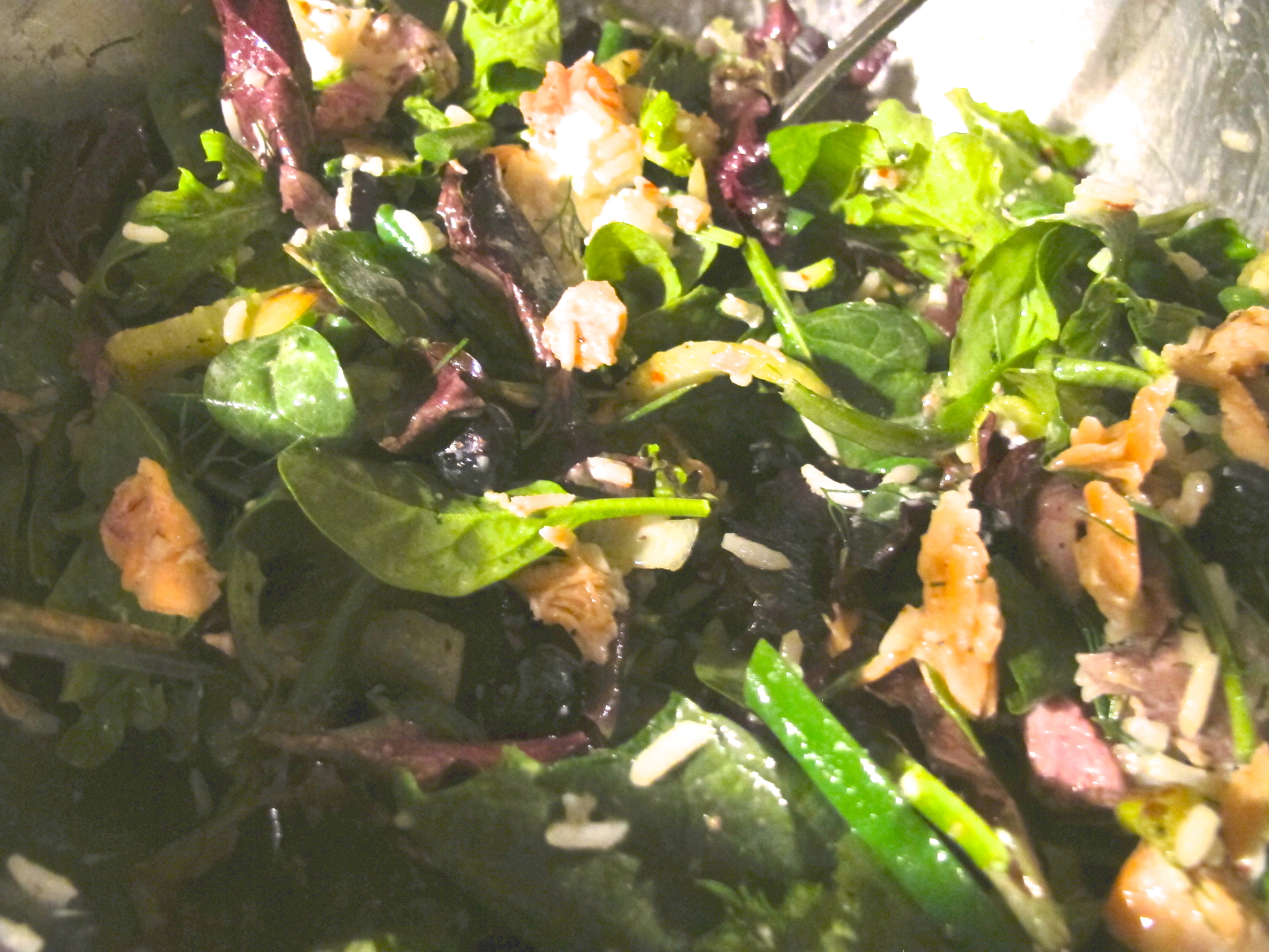 Next day, there was just a bit of salmon and just a bit of steak. Some jasmine rice. I also was flush with fresh greens, goat cheese, and a tub of Fed Ex blueberries. Here’s what came up for dinner:
