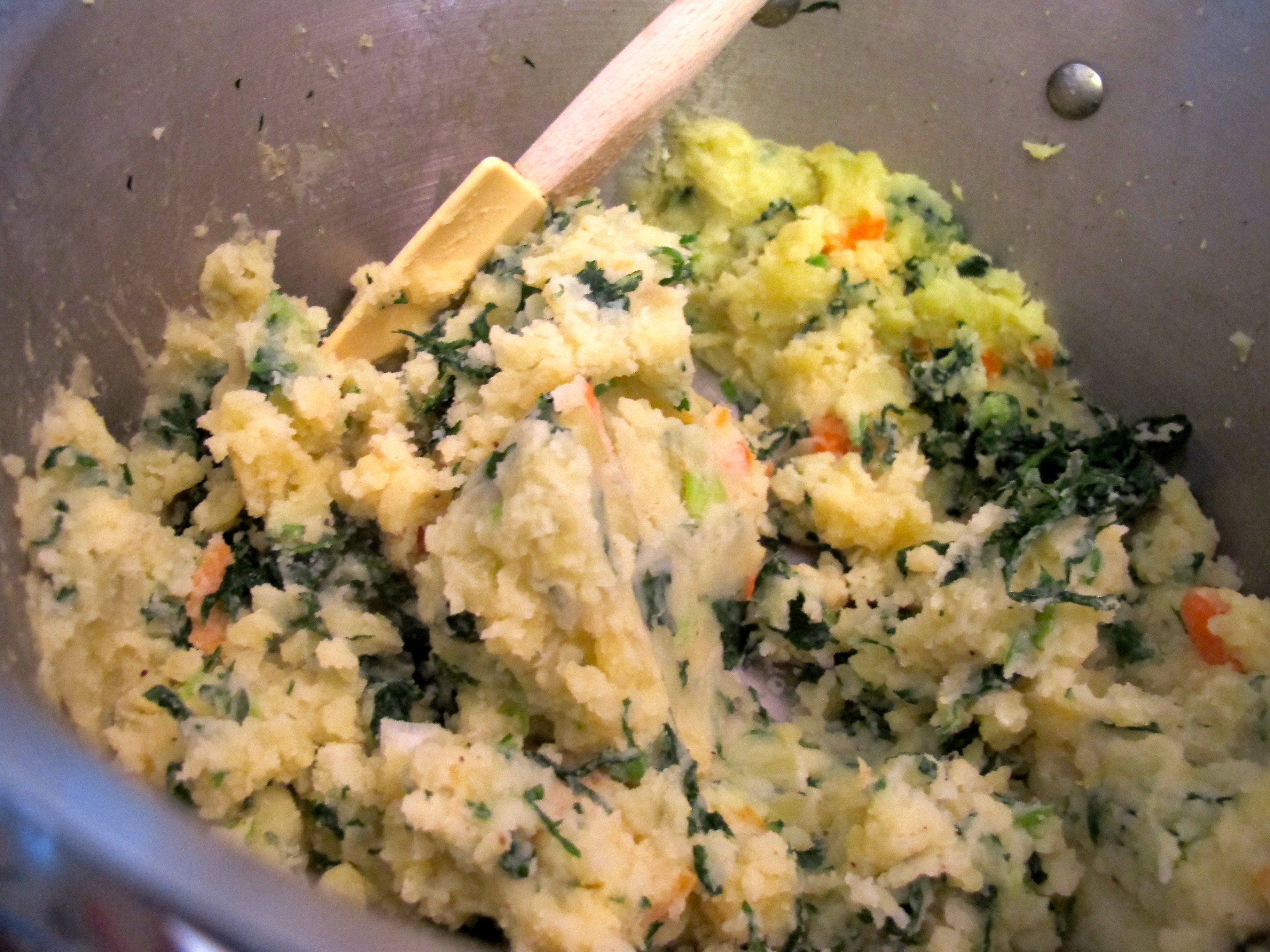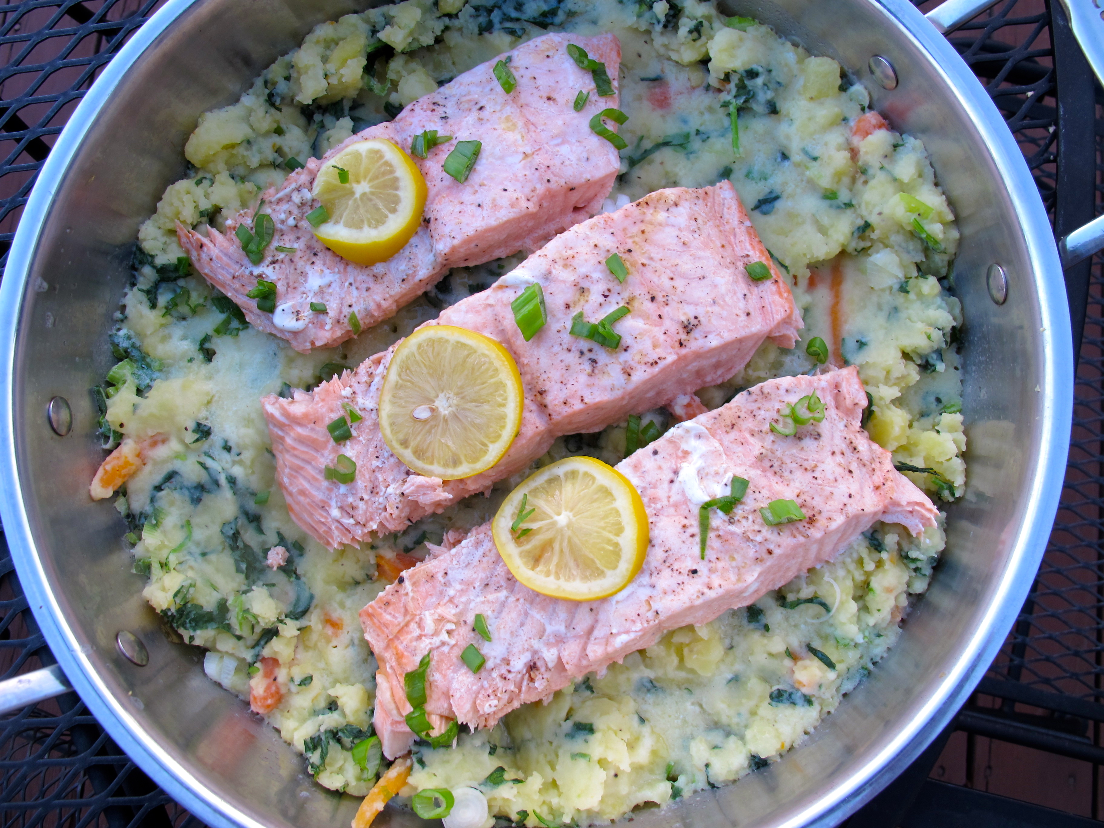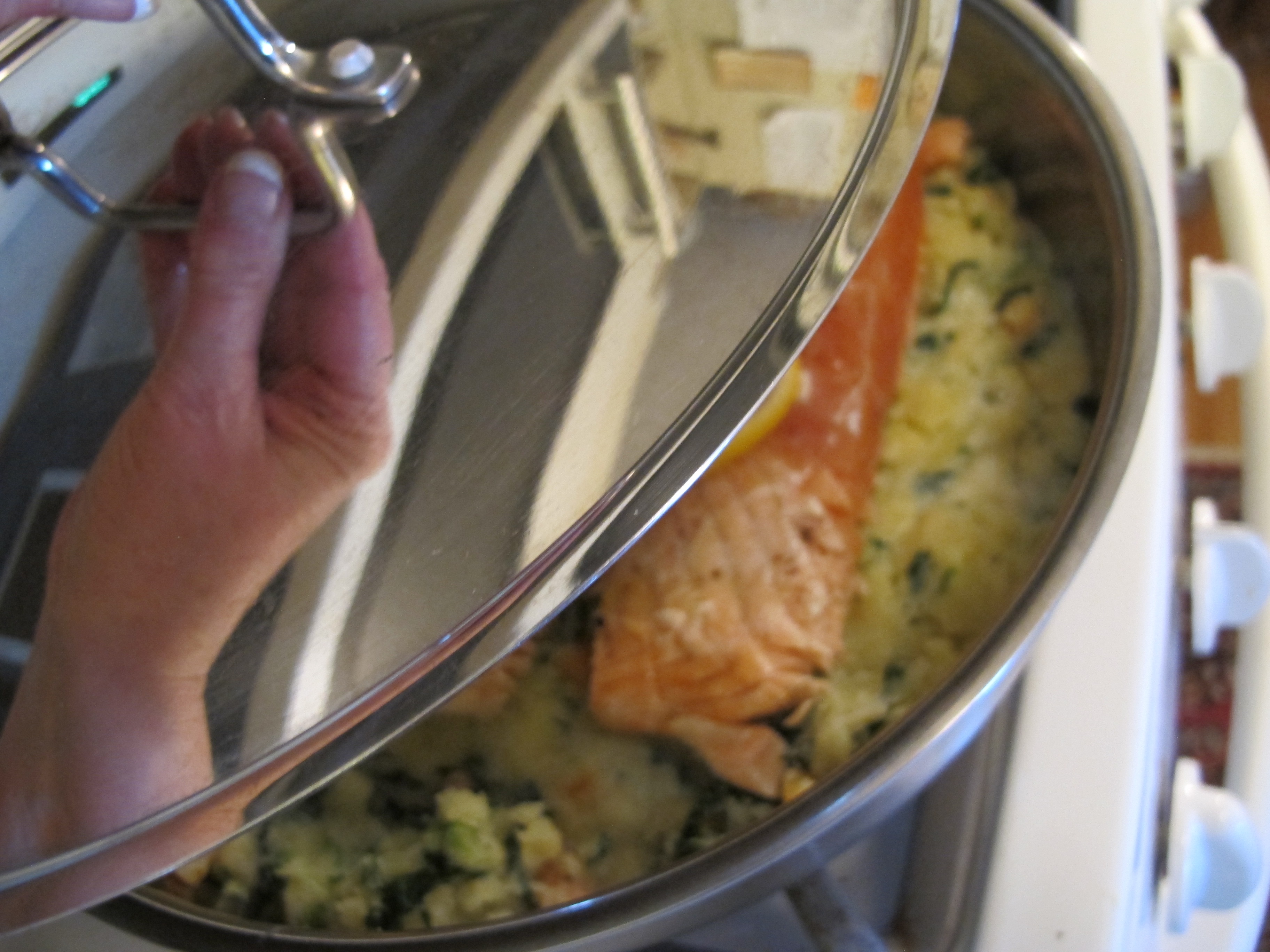METHOD: First… Boil some potatoes with a little carrot and add some kale right at the end of the cooking time. Mash all with hot milk seasoned with green onions. Press the potato mixture into a deep skillet and steam the salmon on top until firm, but moist and tender. I served mine with a few buttered skinny green beans (haricots verts).