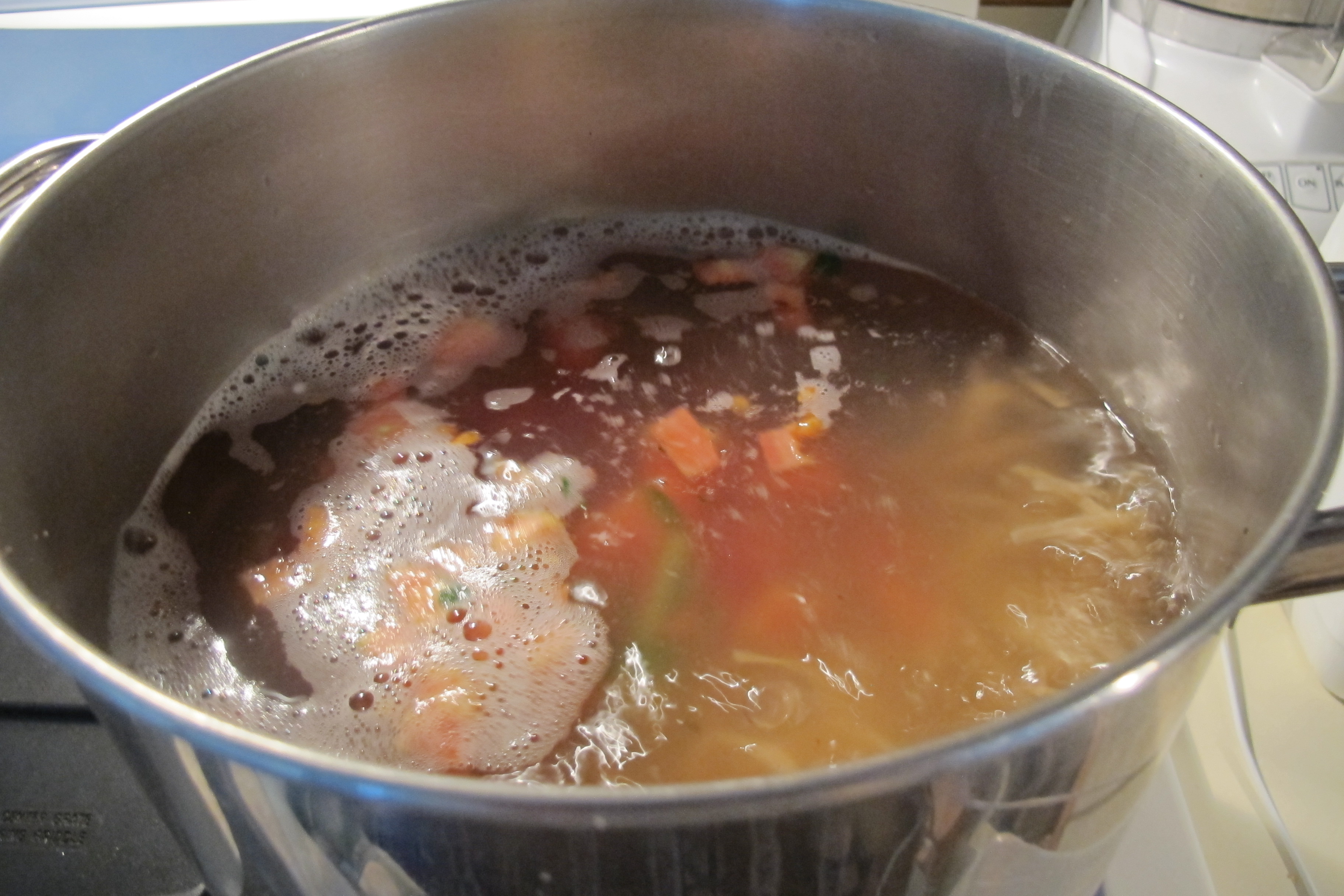 (above: water seasoned with salt, pepper, cloves of garlic, and basil leaves or stems.)