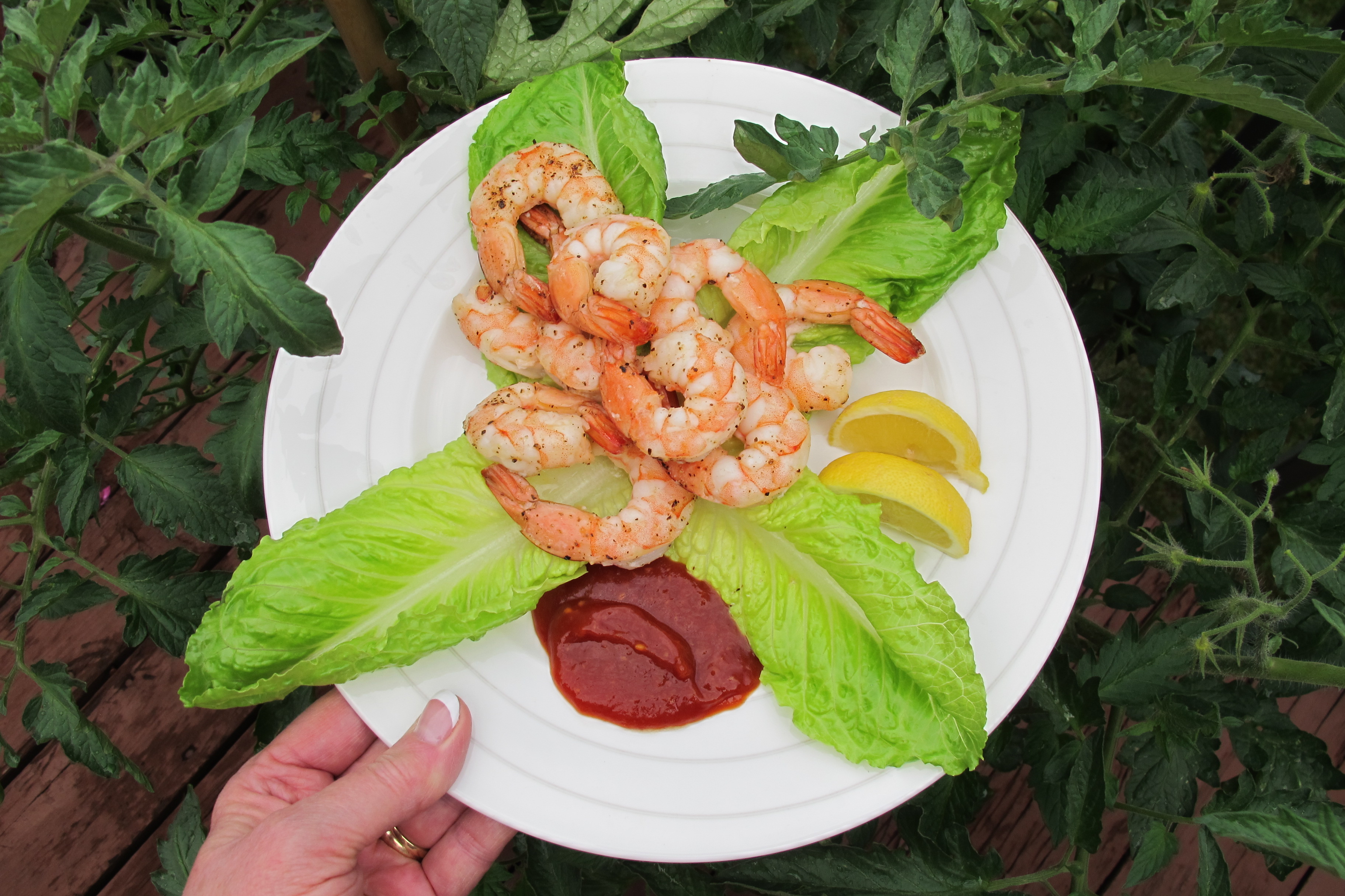 If you like old school dishes, this one’s for you.  No matter how old you are, shrimp cocktail might still sound like something your parents had before their dinner at the steakhouse or maybe mom even made them for starters for Thanksgiving one year. (Is there anything easier or more fun?)  I loved making this.  It was simple, fast, fun, and I made it just for me; the recipe — if you can call it that — is perfect to cut down for one or two.  I had to choose a dish that was so simple it screamed as I nearly have no kitchen.  My utensils consist of a table fork, knives, and a skinny spatula.  I have a bowl and a plate. And a rimmed baking sheet. My cutting board.  Nearly everything else is in the basement or packed away in the garage as we await demolition of our kitchen, which was scheduled next week. And now is put off at least a week or two while we do an asbestos abatement.  Hmph.  Our timeline said we’ll be done by the last week in September.  You heard it here; put it on your calendars and Nah-Nah-Nah me later.