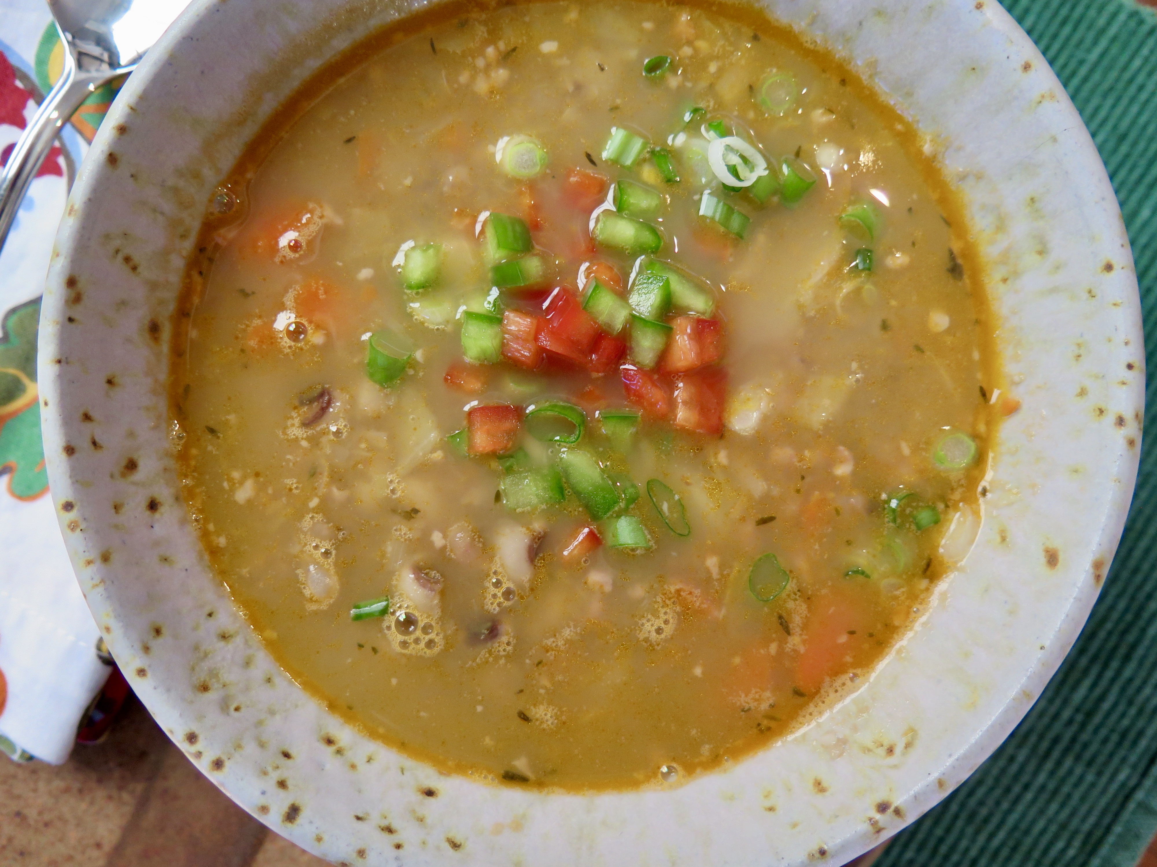 BLACK-EYED PEA SOUP WITH COUNTRY SAUSAGE AND CABBAGE, garnished with green peppers and scallions