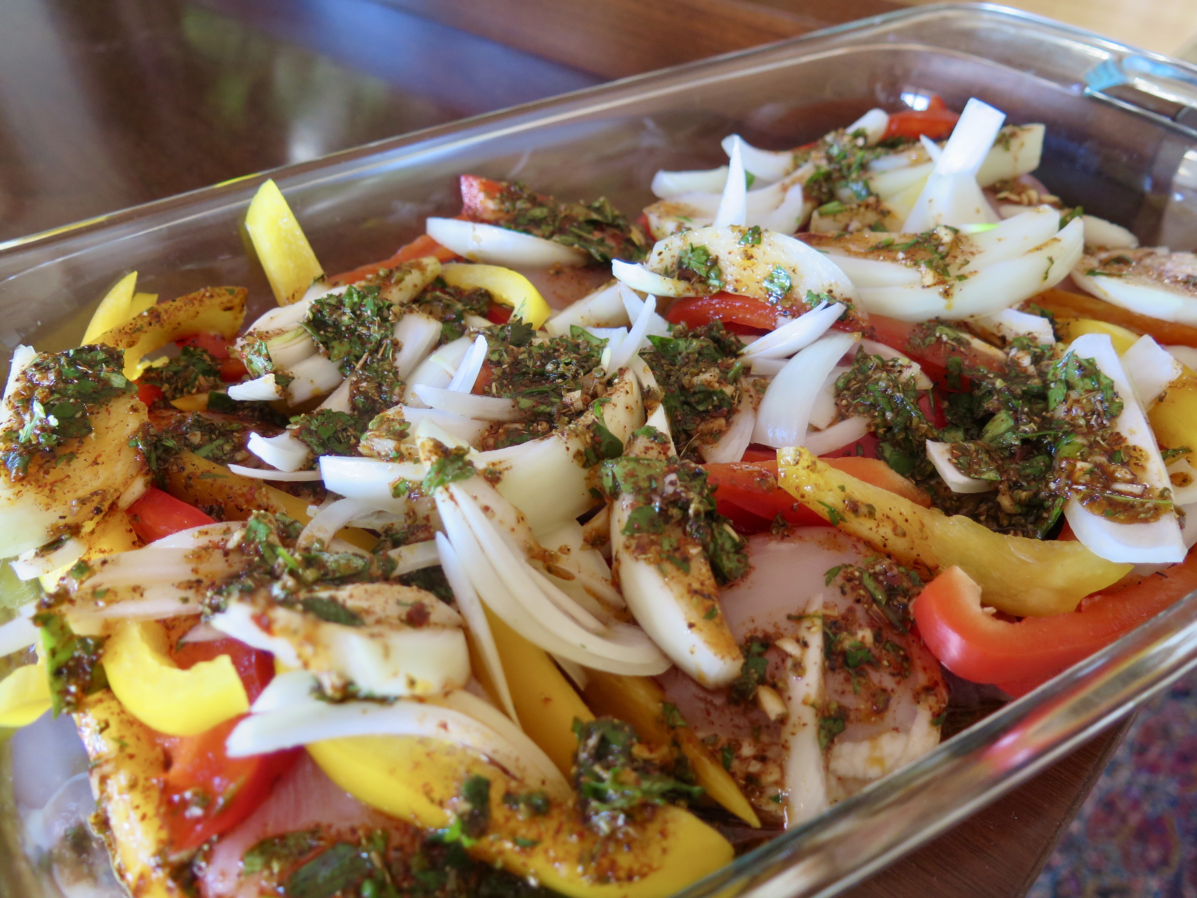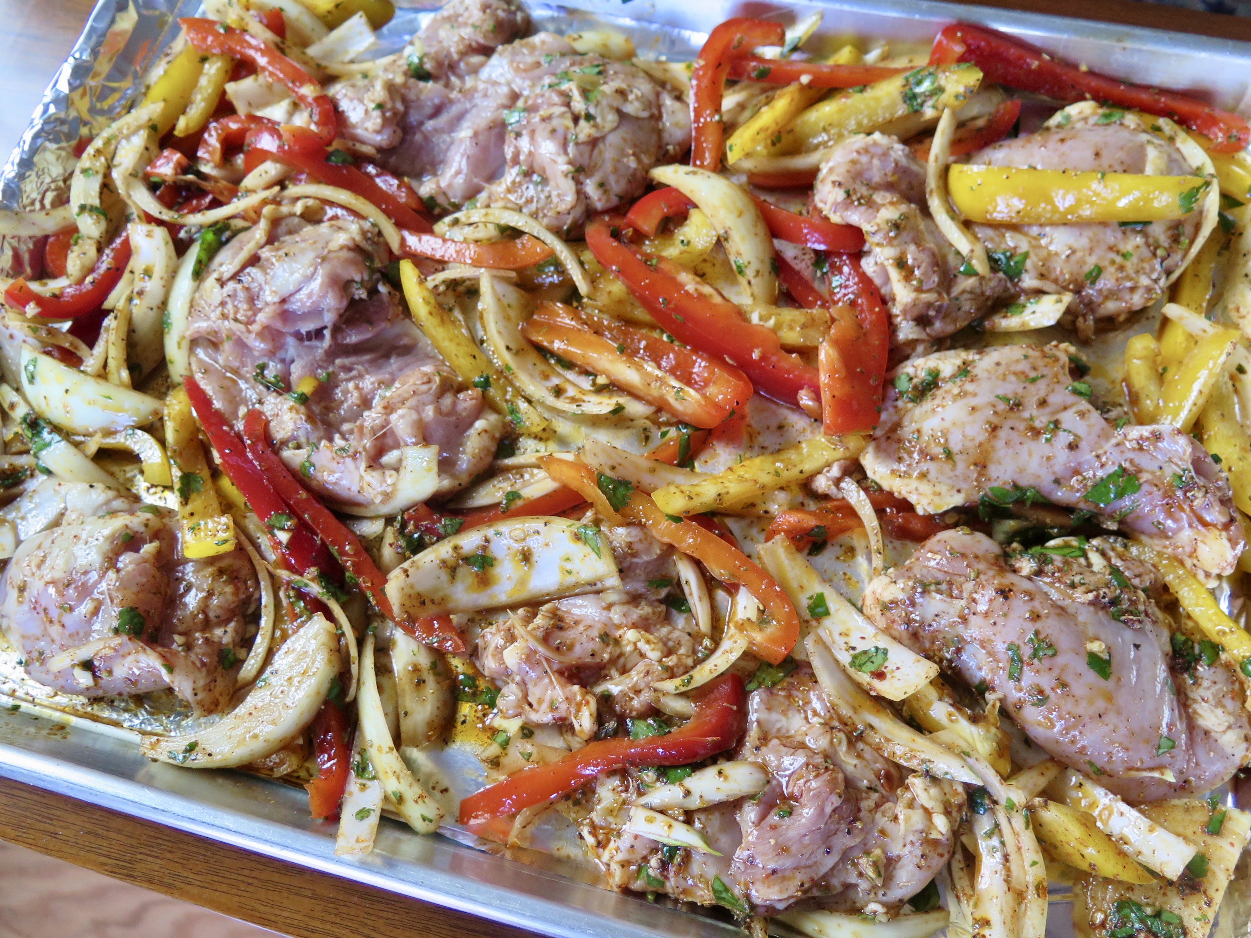 - In a large, shallow glass dish (such as a Pyrex 9×13), place chicken, onions, and peppers evenly in one layer.
