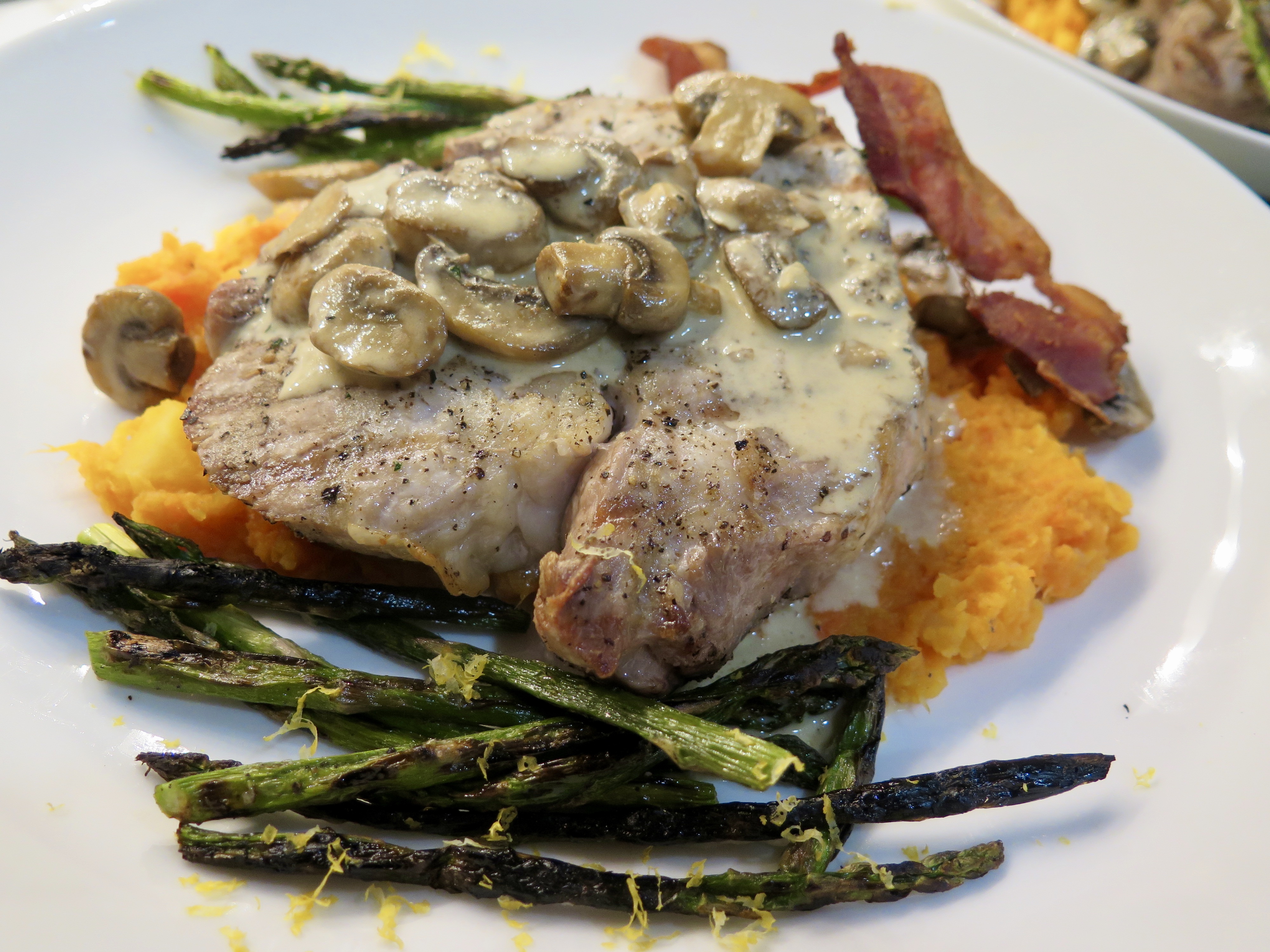 Spoon and smoosh the roasted vegetable mash into an about 6-inch x 4-inch x 1/2-inch bed for the meat and sauce. Add a chop to each and a few stalks of asparagus to each side. Spoon or drizzle mustard-mushroom sauce over each chop and sprinkle the asparagus with the grated lemon. Garnish with bacon if desired.