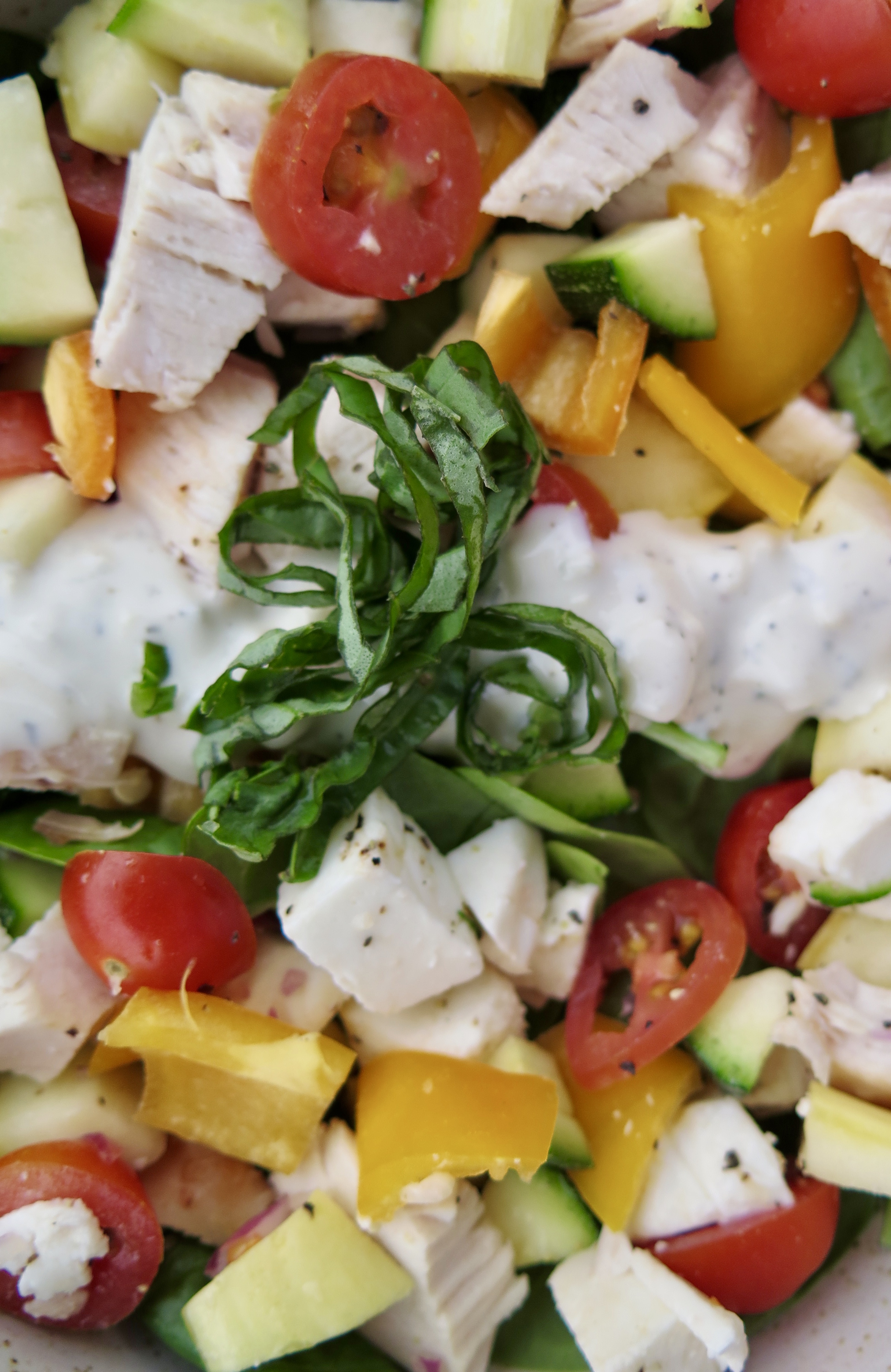 ADD DRESSING, BASIL, AND ENJOY! Drizzle the salads with the Blue Cheese Ranch dressing and add a little basil on top of the dressing. Serve immediately.