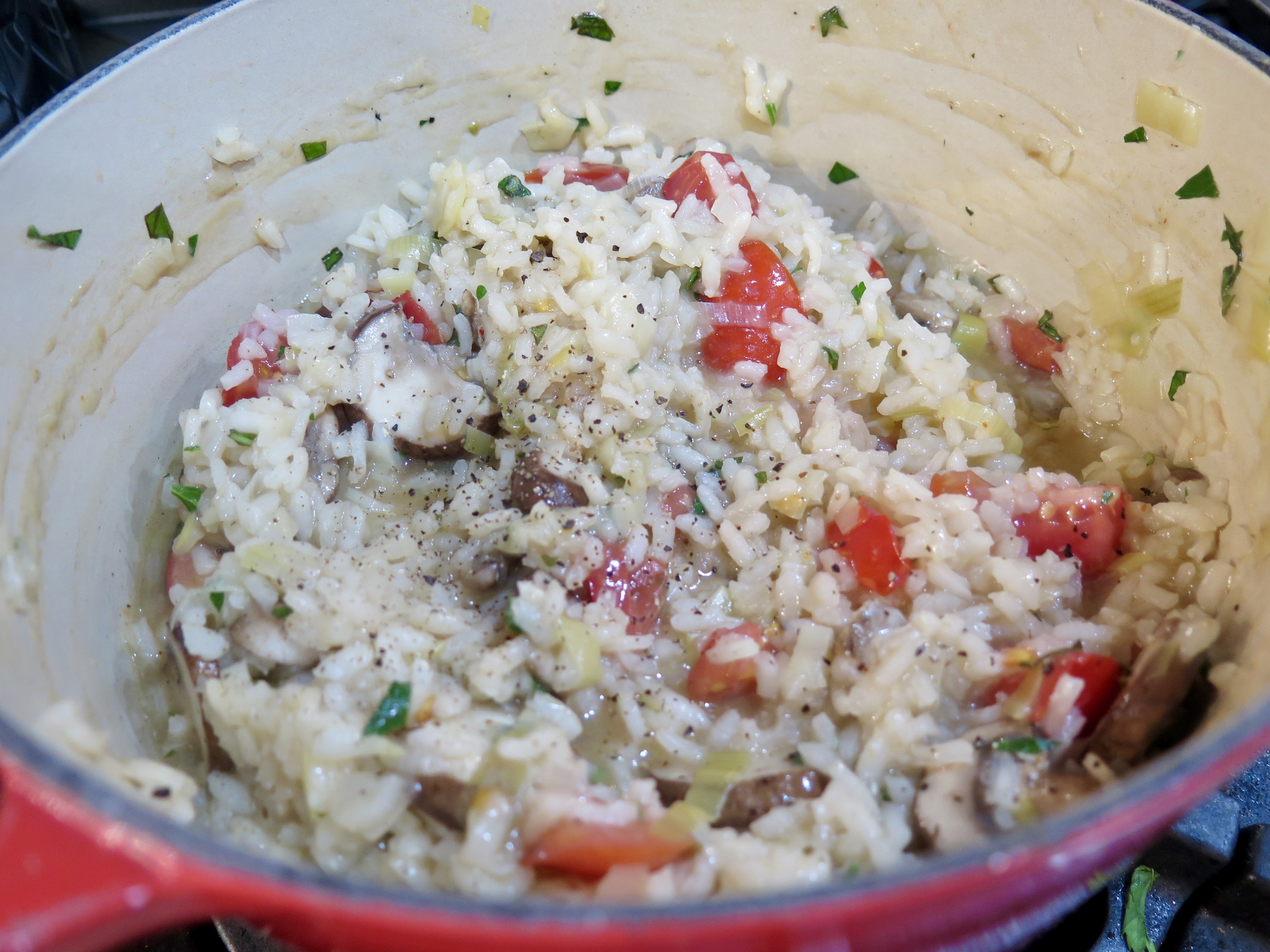 Stir in tomatoes and parsley. Let cook only another minute or so, stirring, to wilt the tomatoes just a bit. Taste and adjust seasonings. It should be creamy, not sticky and not too brothy. Cover and keep warm until needed. If risotto becomes too thick as it sits, add a bit more broth or a tablespoon of butter.