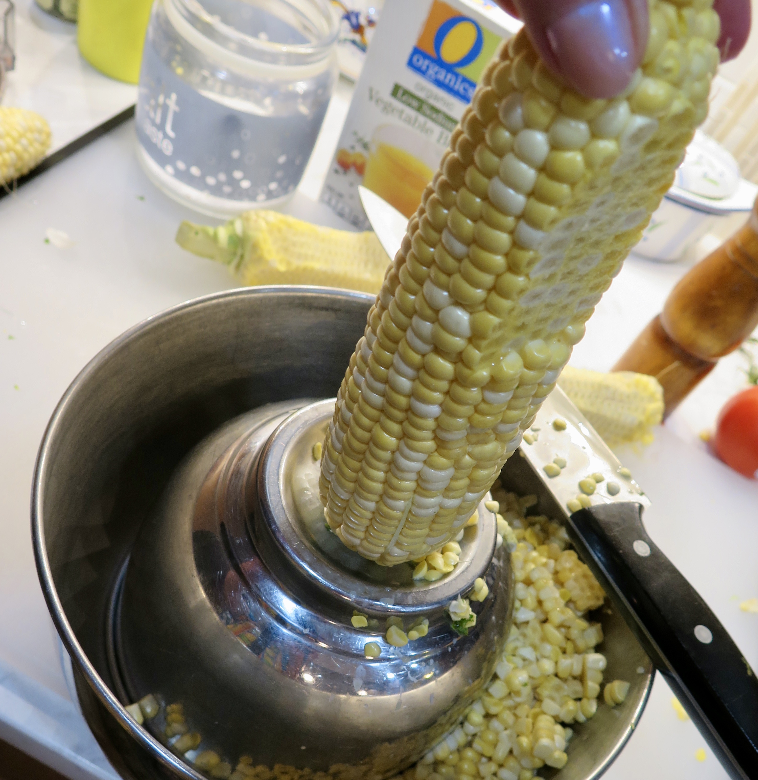 Cook’s Note: If your tomatoes are too acidic, stir in a teaspoon of granulated sugar or honey and/or add a bit extra salt. (Vegans: skip honey.) Easy way to cut the corn kernels shown below. Put a small bowl upside down in a larger one and hold flat end of cob in place on smaller bowl, using other hand to slice off kernels. The kernels and juices are then caught in the larger bowl and aren’t flying all over the counter.