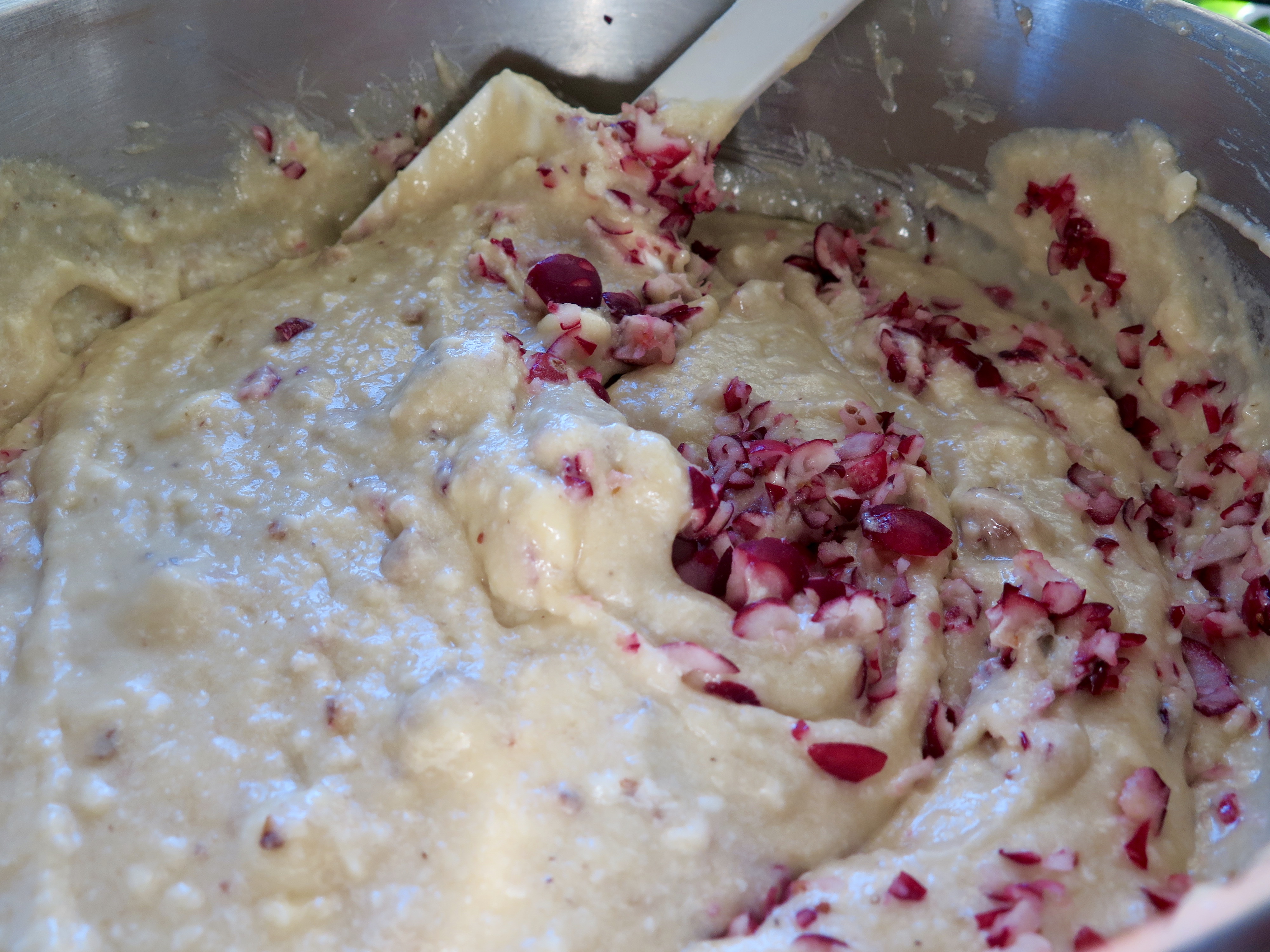 Below: very gently folding in the cranberries to keep them intact and visible so the bread doesn’t turn pink.