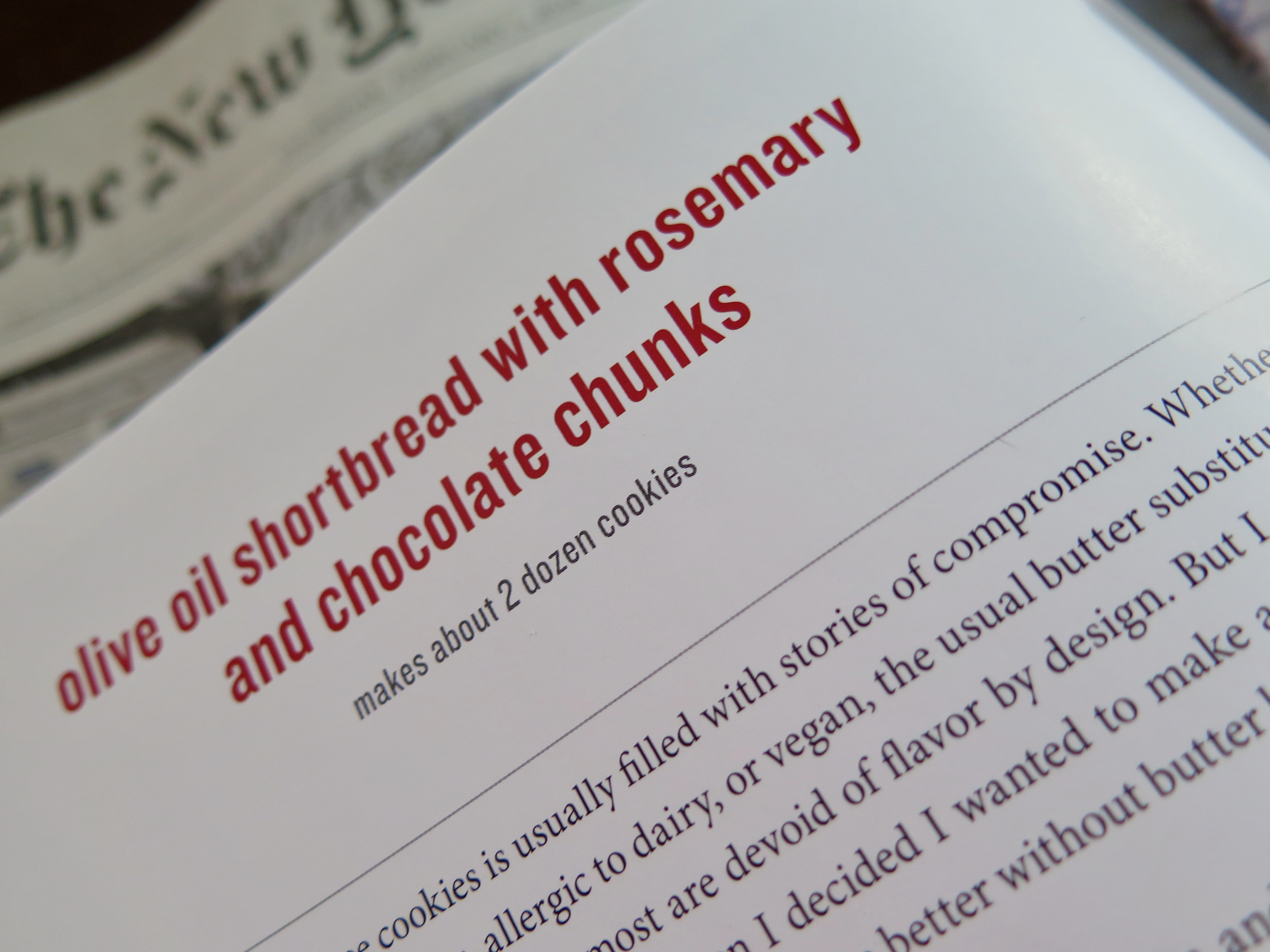 One obviously luscious cookie I really liked the looks of was in the new Smitten Kitchen Cookbook, SMITTEN KITCHEN EVERY DAY. (Lots of lovely cooking to be done with that little tome!) It’s an olive oil rosemary shortbread with chocolate that’s rolled out into circle and baked just like that. I know, right?