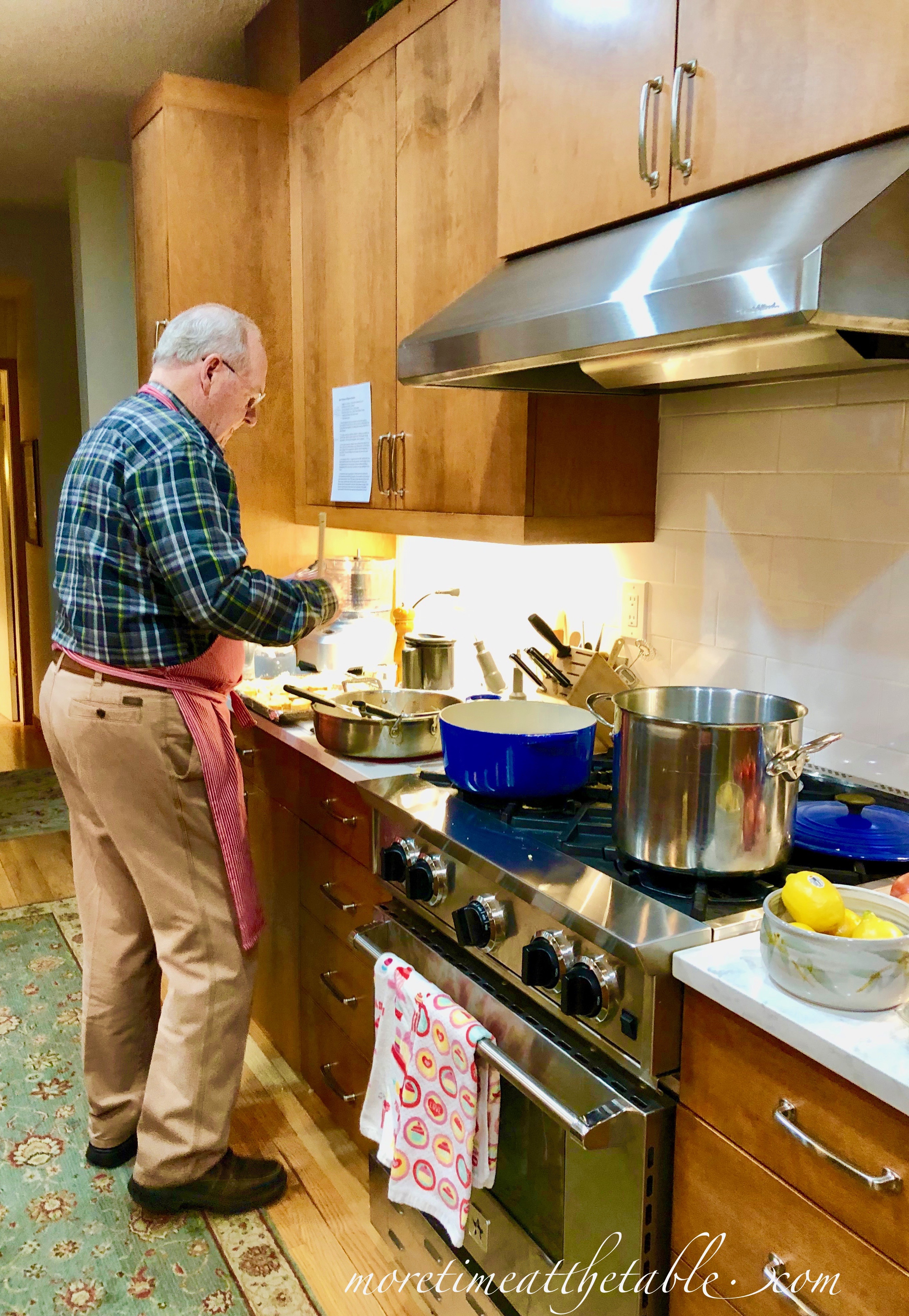 Fast forward years. My good friend and neighbor Jim Mahoney (pictured above), who has done several cooking classes with me over time and lives cattywampus from us with his lovely wife Christa, handed me a recipe one day and said, “I’ve always wanted to make this, but just haven’t. Could we have a private class and do it?”  “Sure,” says I, little knowing that time would go on and on — how embarrassing — and I couldn’t get it scheduled. Jim would go to Germany; we’d fly to France.  I’d visit friends in St. Paul; Jim headed for Hilton Head with Christa. Over last Christmas, we just assigned a January day to do it — and still ended up postponing it one more week!