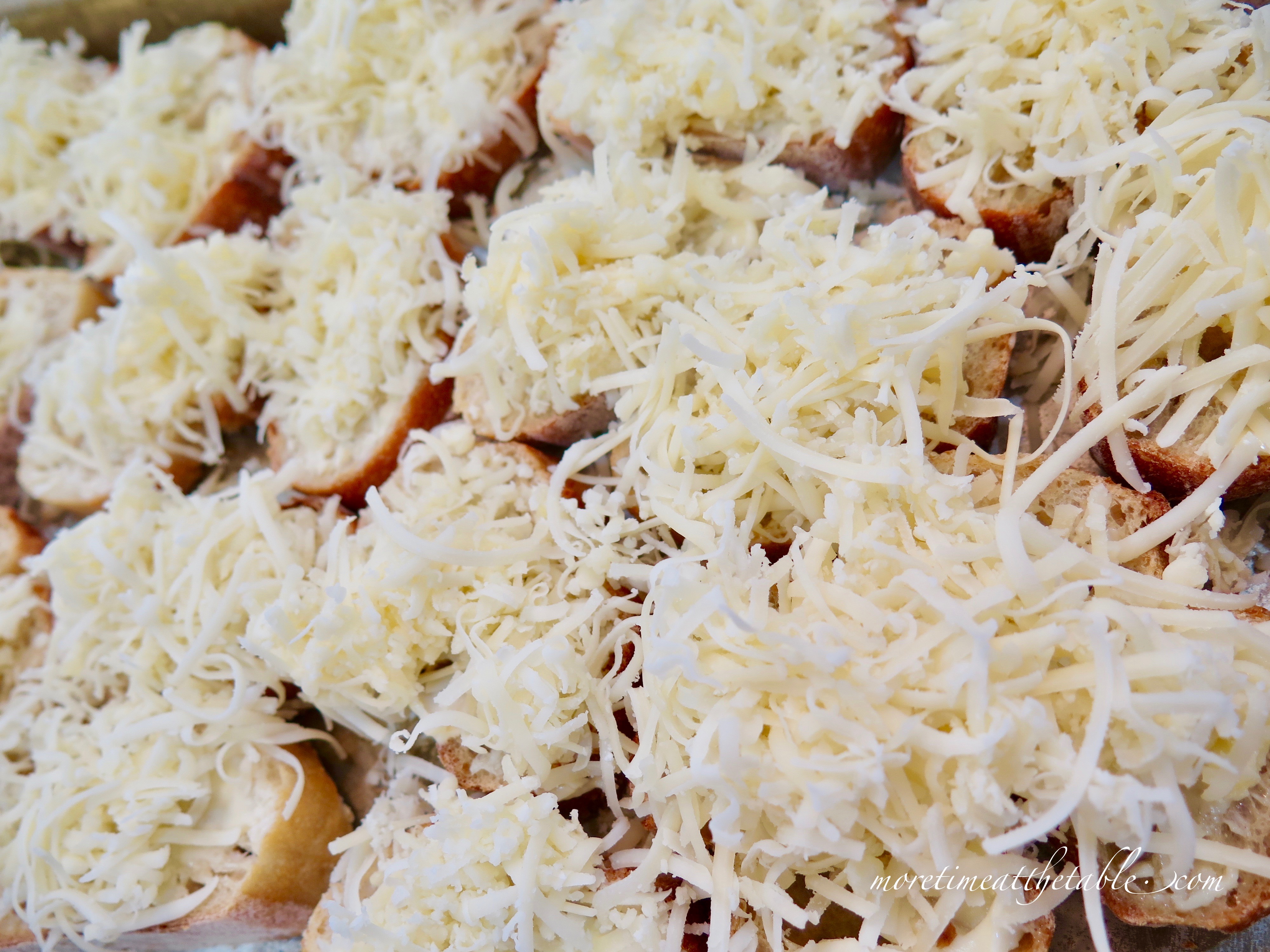 2. Preheat the oven to 350 degrees. Place slices of bread on a rimmed baking sheet and toast the them for 10 minutes.  Remove sheet from oven. Flip each piece of bread over, return to oven, and let toast another 5 minutes.  Remove to a rack and let them cool. Spread a generous layer of butter on each slice (you will need about 5 tablespoons), then lay the slices close together on a baking sheet and top with all but 1/2 cup of cheese–1/4 cup of each kind. (You’ll top the dish with that reserved cheese in a moment.)