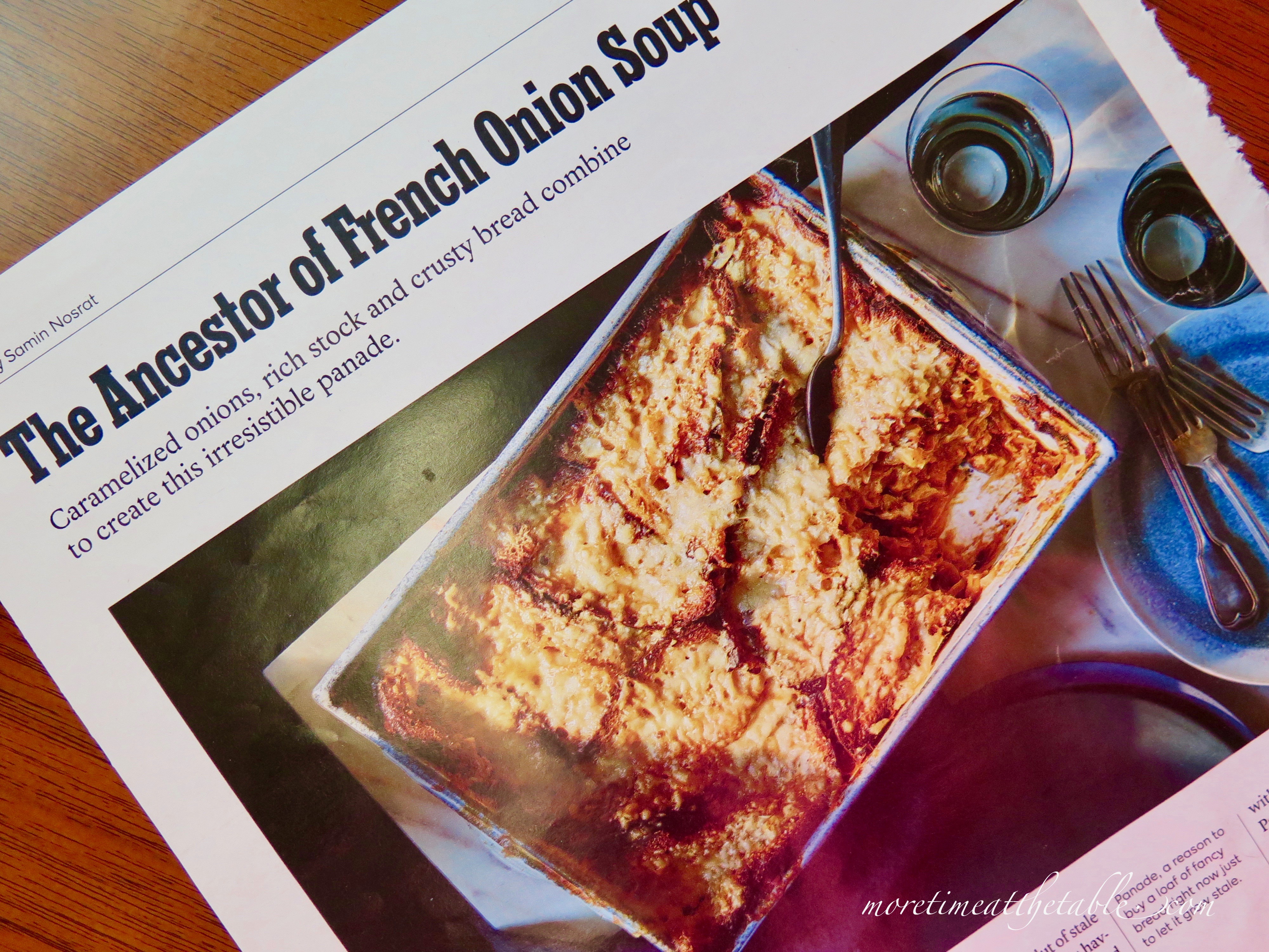 Jim’s recipe, stored in his kitchen for 12 years and through 2 kitchen remodels, was from Amanda Hesser’s article,  “Recipe Redux –1907: Soupe à l’Oignon Gratinée”. (New York Times Magazine, February 11, 2007)  Note:  You can look it up if you take the NEW YORK TIMES or have bought a subscription for the recipes. I glanced briefly at it and without much thought assumed that while it looked like onion soup, perhaps it was more of a pie or a gratin? I had puff pastry or something in my mind, but didn’t look closely enough to figure it out. I did, though, as time went on, and we still hadn’t had our class, save a new onion tart recipe, and also tore out Samin Nosrat ‘s “The Ancestor of French Onion Soup” (NYT Magazine, February  4, 2018)  meaning to compare them all at some point. Good intentions had I.  Last week, and none too soon, I read the entire article, re-read and saw we were making a savory bread pudding or a panade, as a Samin Nosrat would call it in her article, but it still wasn’t a soup, per se.