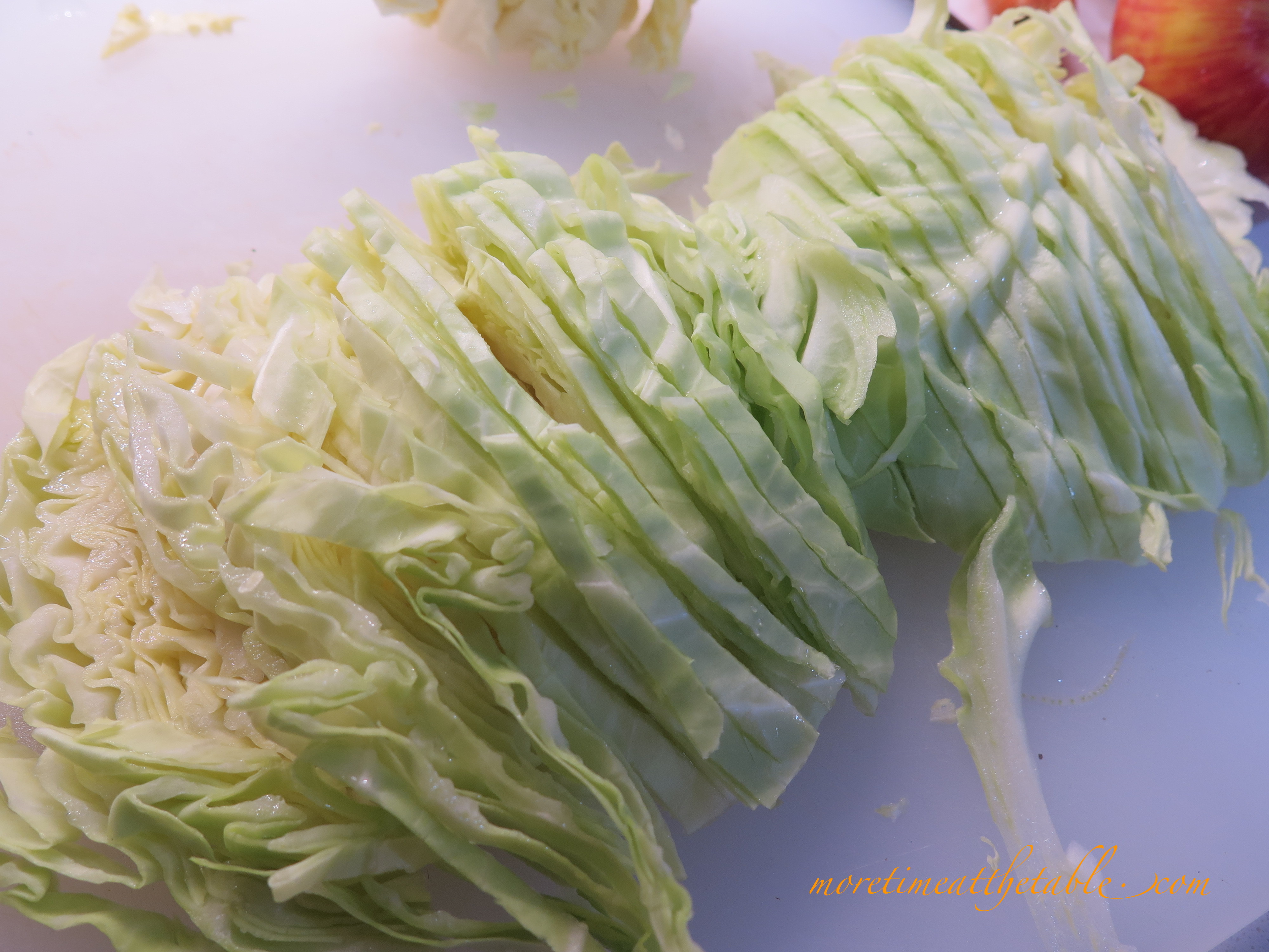 Shredding the cabbage…cut four “cheeks” off the head of cabbage, discard the core, and slice thinly.
