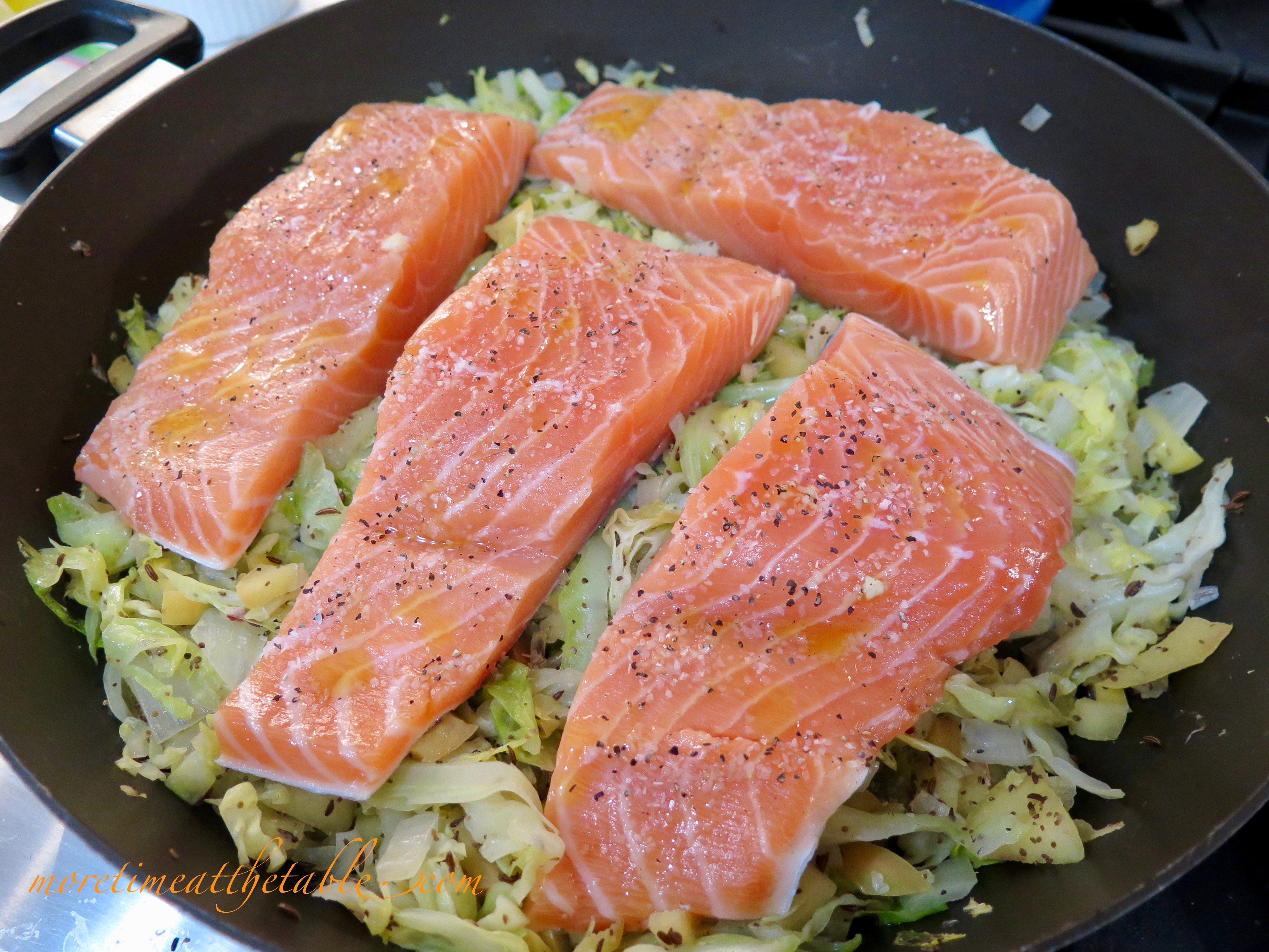 For a few days, with FRIDAY FISH perking in my head, I kept dreaming about salmon on cabbage. How, why, what…I wasn’t really sure. I had to think about it. Over the years, I’ve cooked a lot of salmon — or other fish — on vegetables. (Scroll down for a couple of recipes similar to this one.) Without question, there’s little simpler than sauteing a big pan of veggies and laying a few fish fillets on top. Add a lid to the pot, pour the wine, and dinner is served. It couldn’t be easier or faster. I first began fixing fish this way in graduate school at the University of St. Thomas (St. Paul, MN) when I had so little time to make dinner that it all had to go in one pan or not get done. Still, it’s now totally in tune with today’s sort of cooking–quick, uncomplicated, tasty, and low-carb.