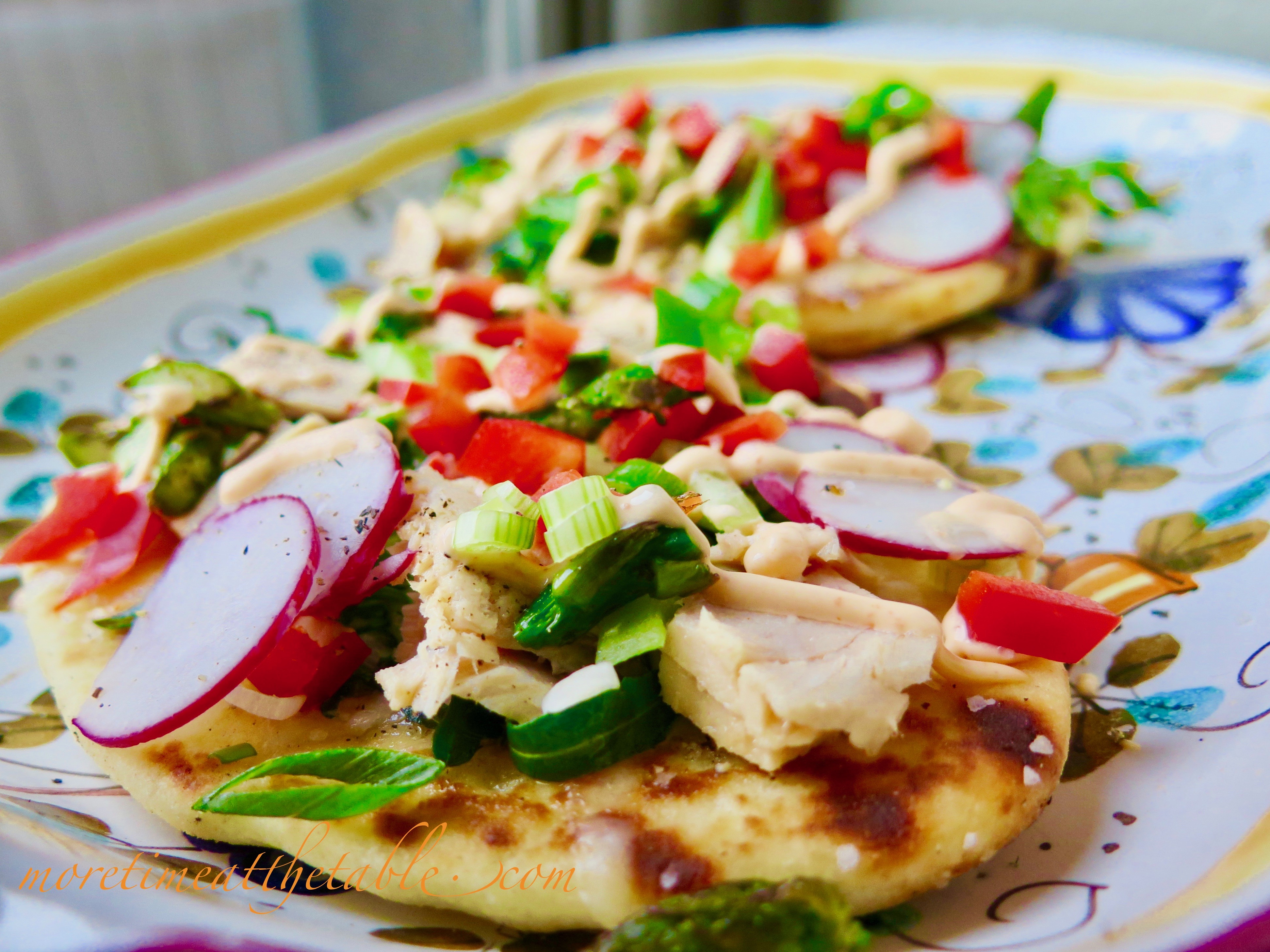 - Meanwhile, toss the arugula with a drizzle of the lemon and olive oil vinaigrette. Divide the dressed greens between the grilled flatbreads and top with a sprinkle each of the vegetables (cucumber – asparagus). Add the chunks of tuna on top of the vegetables. Sprinkle with a last bit of salt and pepper. Drizzle with Sriracha Mayonnaise and serve warm or at room temperature.