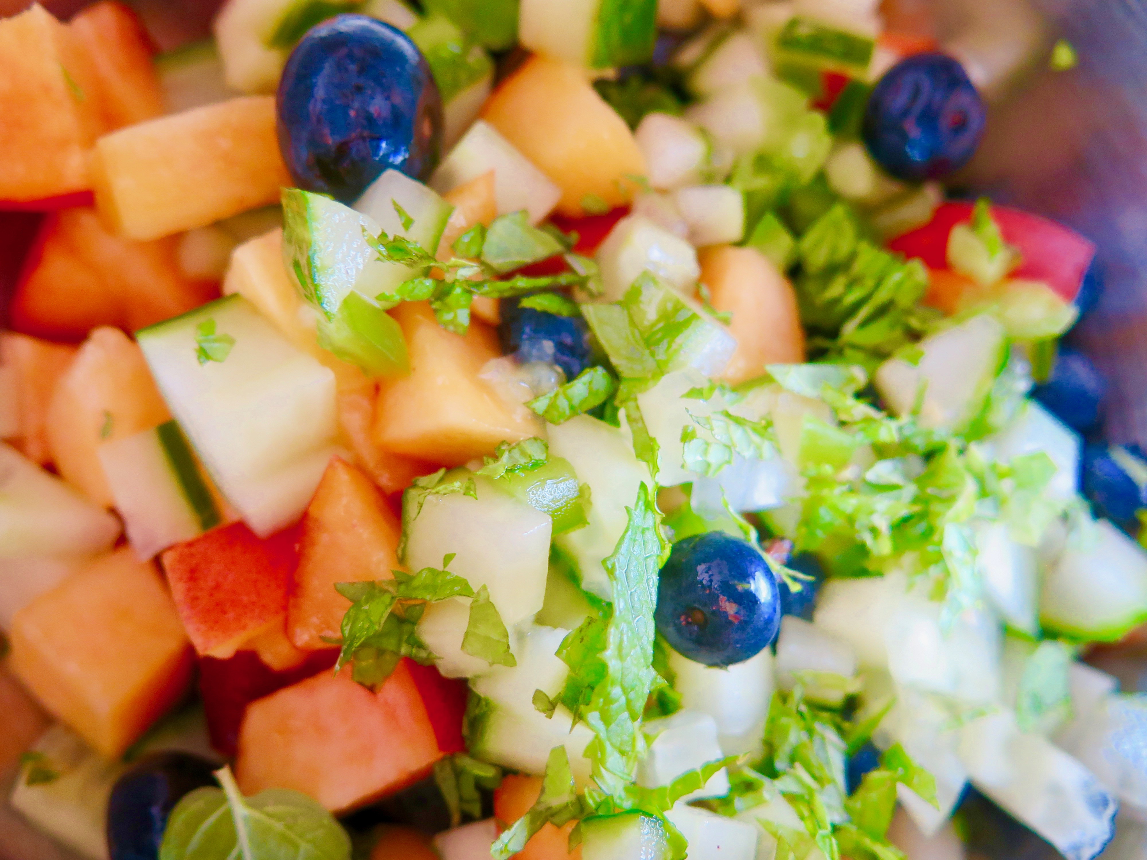 I had these ingredients: peaches, Canadian blueberries, mint, lime, cucumber, and jalapeño. Chop, chop, stir, taste…repeat… all while the chicken brined for an hour. (It needs only that long, but definitely no longer than 2 hours or it’s tough.)
