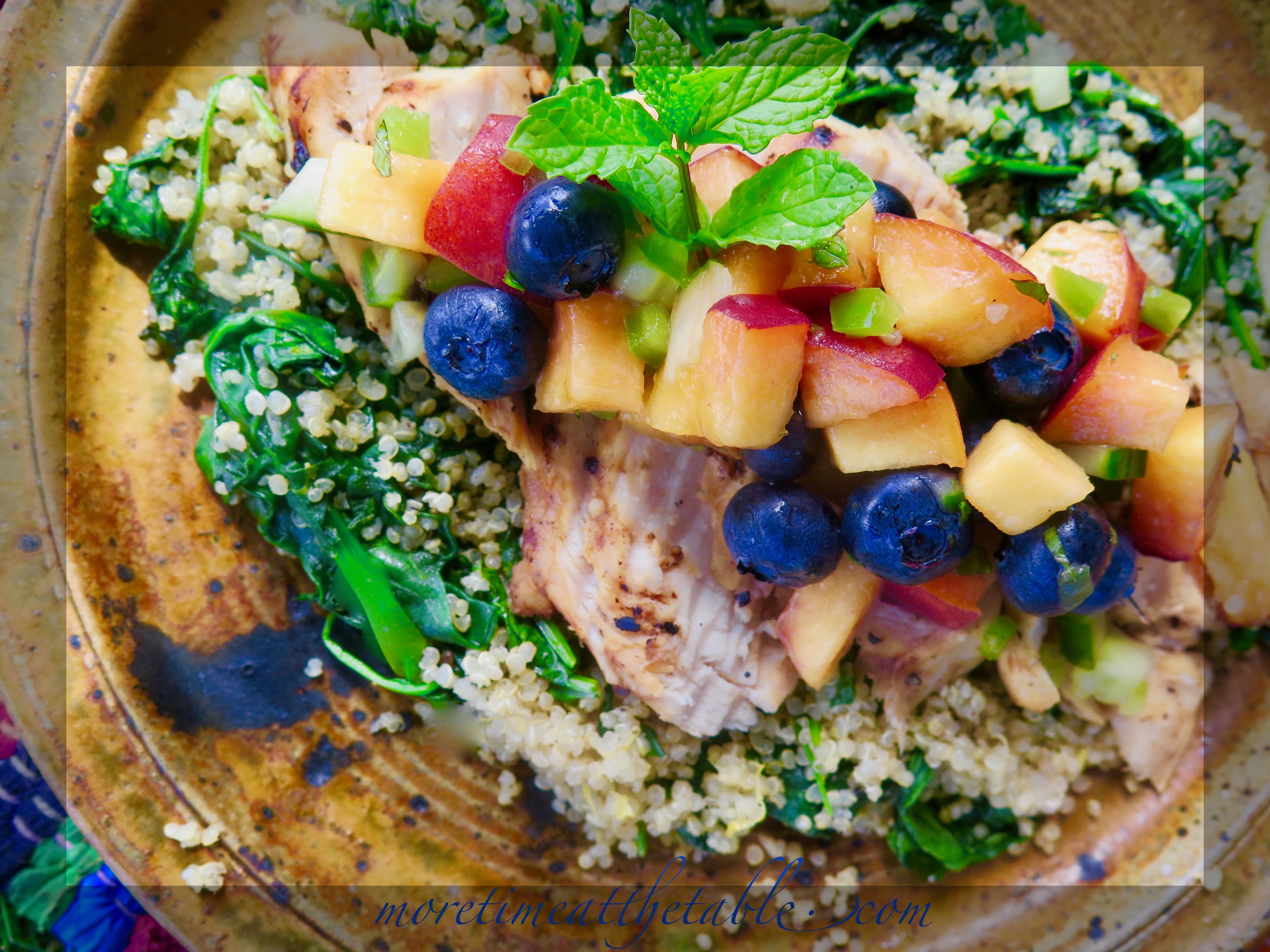 grilled chicken breasts with blueberry-peach salsa served on lemony sautéed spinach with quinoa