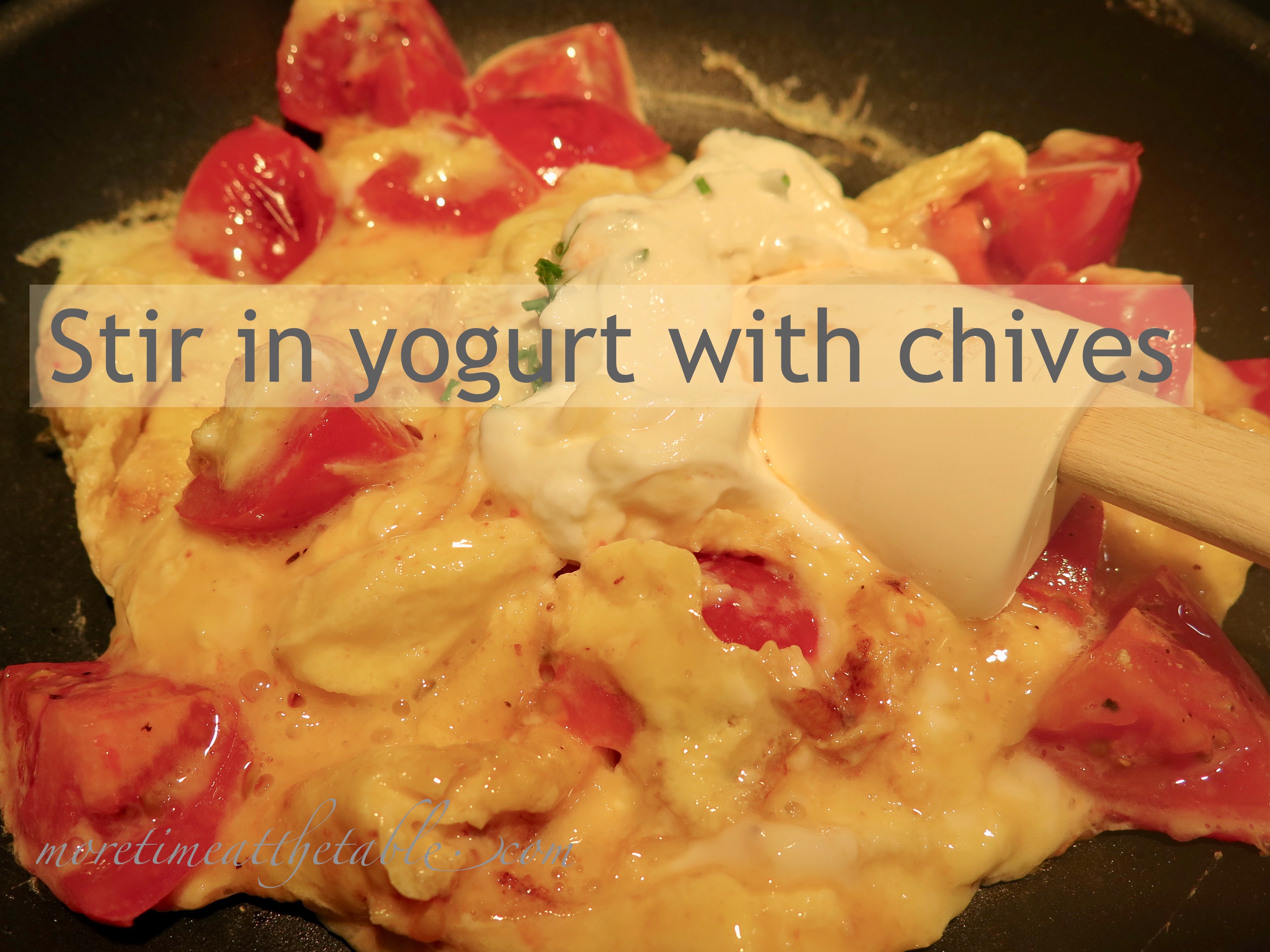 - Pour the beaten, seasoned eggs over the hot tomatoes and cook a minute or two or until about half-set. With a small rubber spatula, pull the eggs in gently from the sides and stir in the chive yogurt. Cook briefly until the yogurt is warmed-through, perhaps another minute. Turn down or turn off the flame if the eggs are cooking too quickly.