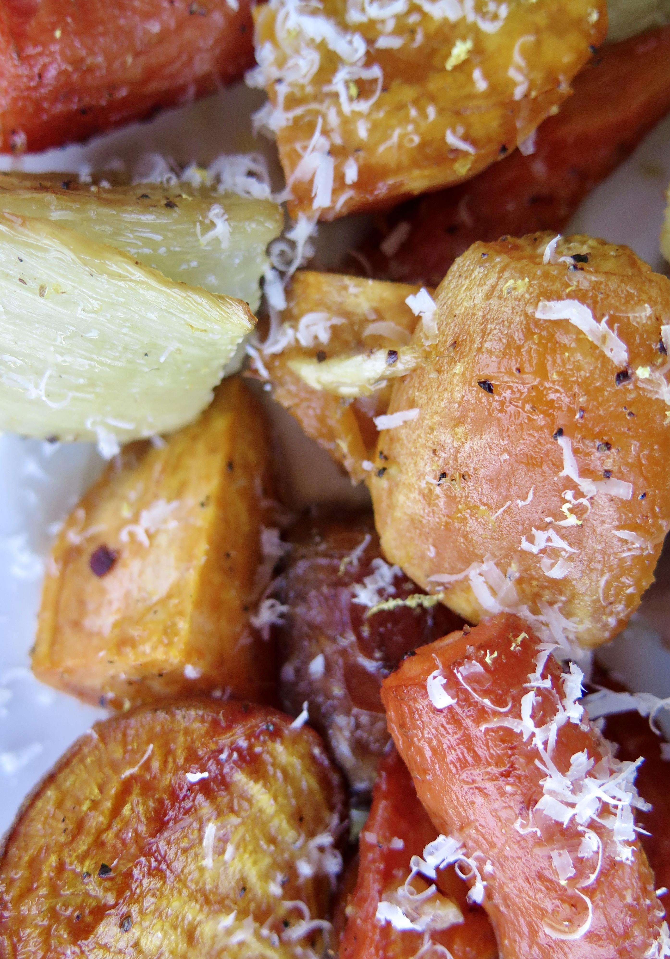 - Add all of the remaining vegetables (onions –carrots, including the other 2 cloves of sliced garlic) to a large bowl, drizzle with 3 tablespoons olive oil, and sprinkle with one teaspoon of salt, half teaspoon fresh ground black pepper, crushed red pepper, and reserved lemon zest. Toss gently together and then scatter around the chicken in the roasting pan.