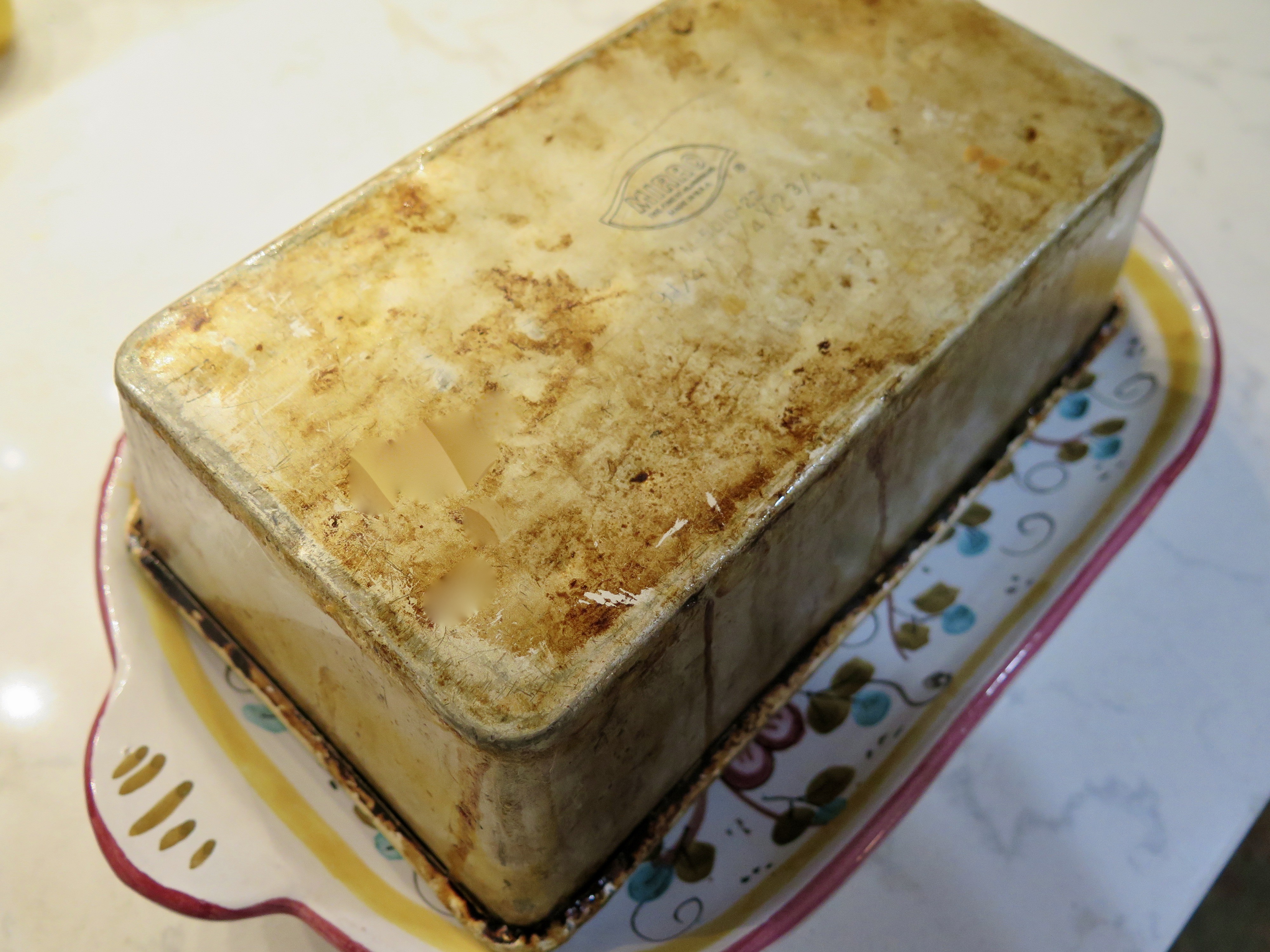 To turn out onto a serving platter, you can first top the pan with the upside down platter and, holding it carefully together (use mitts/potholders), turn it over–as seen below– and THEN remove the baking pan. Make sure you have first run a small sharp knife around the edges of the meatloaf, gently banged the pan on the counter, and then tipped the baking pan out into the sink or the sheet pan to allow the extra juices to escape. Still some left on the bottom of the pan? Carefully scrape it out with a sharp spatula, replace it on the loaf from whence it came, and cover with marinara! ( OR: If you’re incredibly brave, just do the knife trick, bang gently, and sling that sucker over onto the platter.)