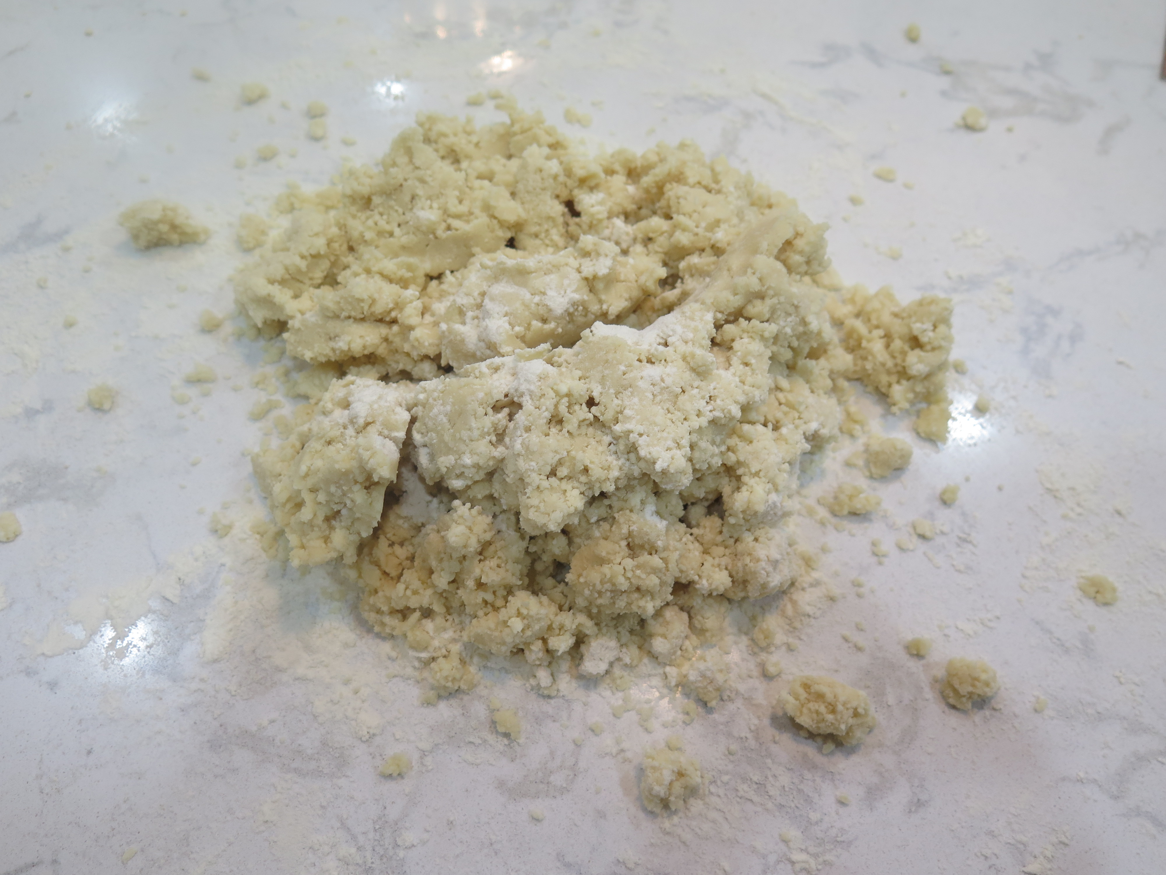 Stop processing the dough before it comes together and turn it out onto the floured counter.