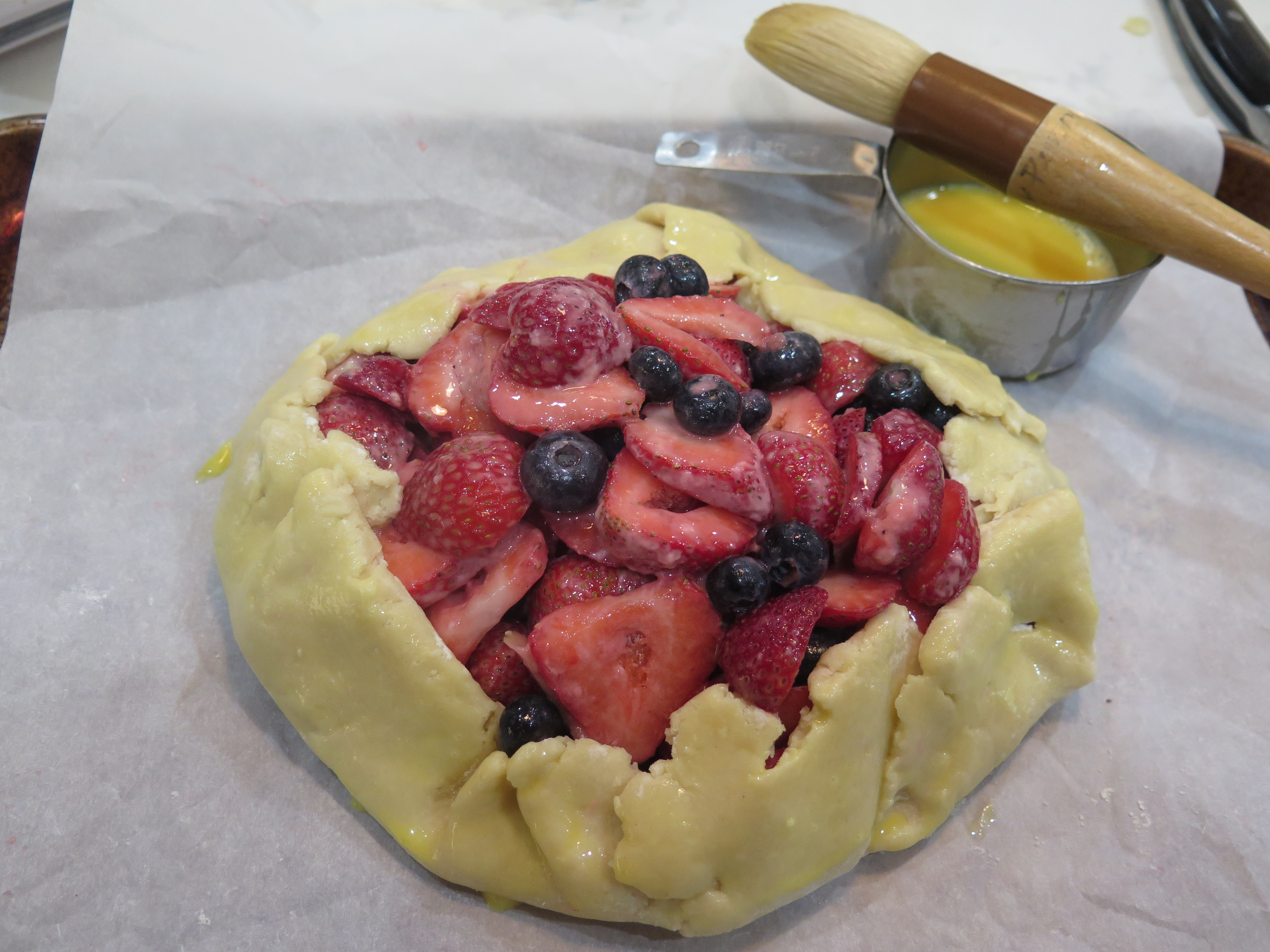 STIR TOGETHER THE BERRY FILLING AND SPOON INTO THE CETNER OF THE DOUGH. FOLD THE DOUGH UP, PLEATING AS NECESSARY, AROUND THE FILLING. BRUSH PASTRY WITH EGG MIXTURE: