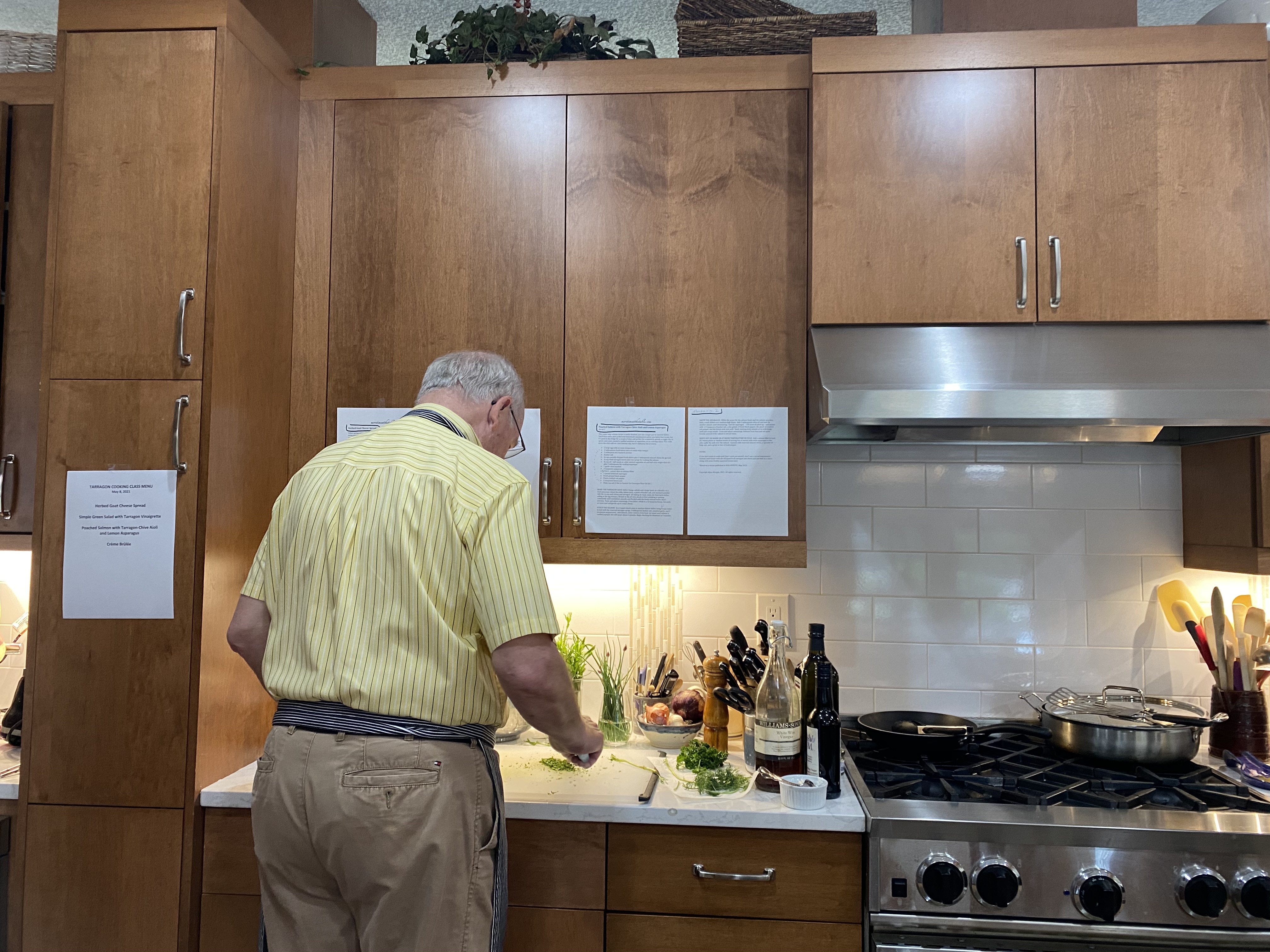 When it was time to plan my friend and student Jim Mahoney’s (pictured above mincing herbs) French Tarragon Class and I looked for an appetizer highlighting his favorite herb, I needed to look no further than my own garden’s first fruits to come up with the most local (!) ingredients for one of my simple-to-make, but special-to-eat cheese spreads — something I’ve made for years. A basic version is even in my soup cookbook, SOUPS AND SIDES FOR EVERY SEASON, from way back in 2014.