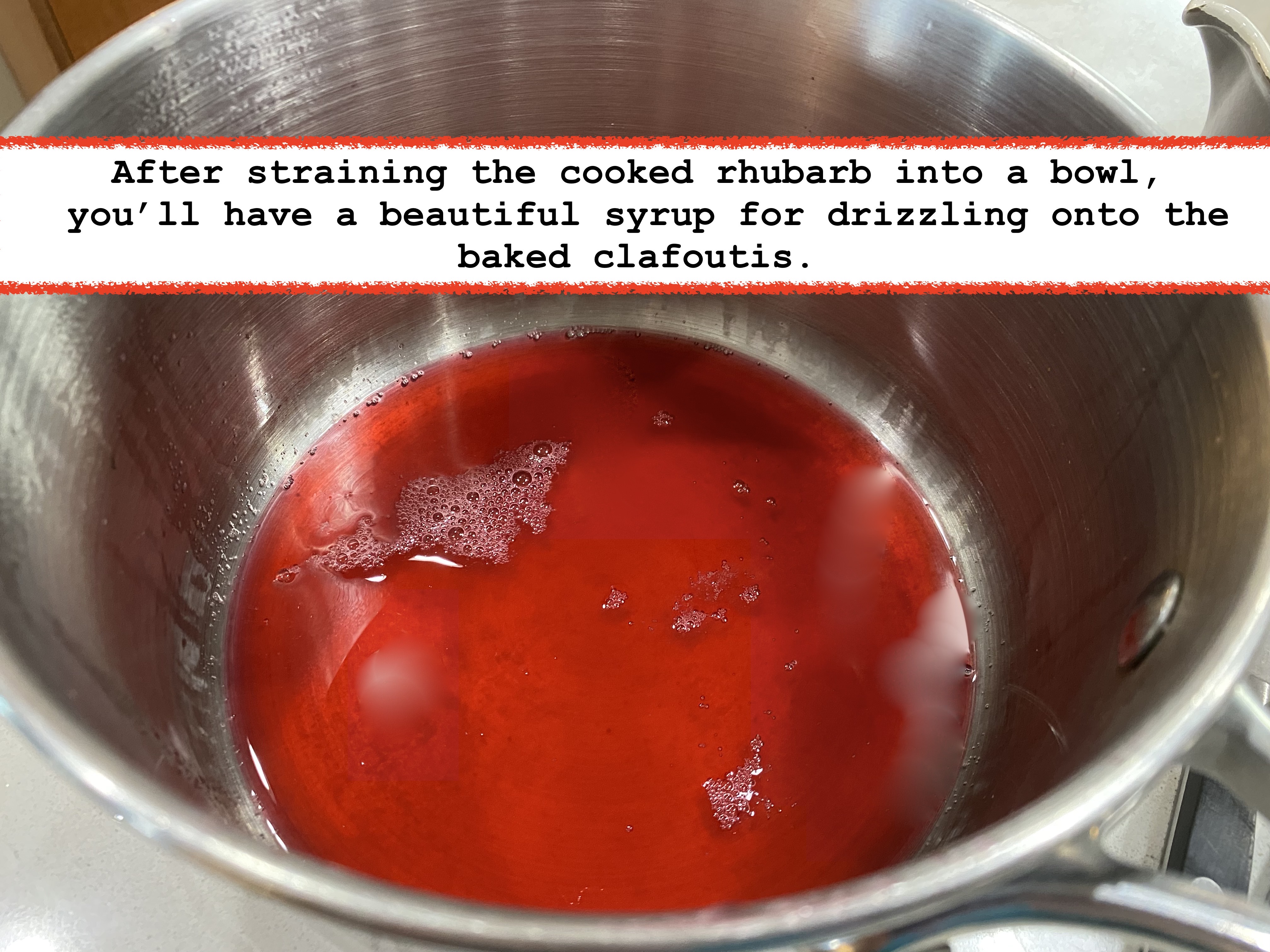 - COOK THE RHUBARB: Add rhubarb, ½ cup granulated sugar, the ¼ cup water, and a pinch of salt to 3-quart saucepan. Heat to boiling, reduce to a simmer, cover, and cook gently for 8-10 minutes or until rhubarb is tender. Strain rhubarb into a bowl, reserving the resulting syrup to use as a drizzle on top after the clafoutis has baked. Set aside both the rhubarb and the syrup.