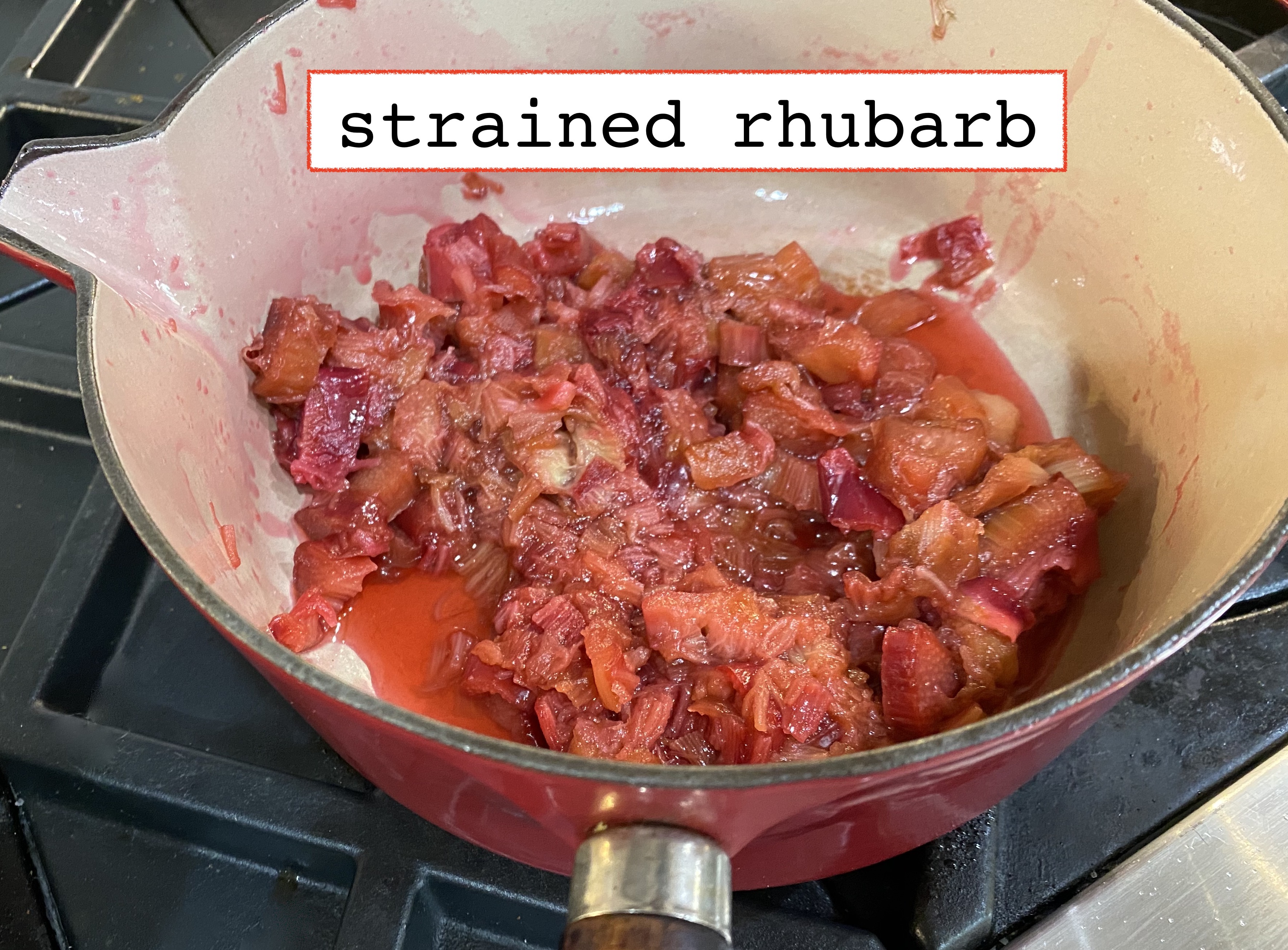 Start with cooking the rhubarb in a pot with sugar and water, then strain it into a bowl to end up with something like this: