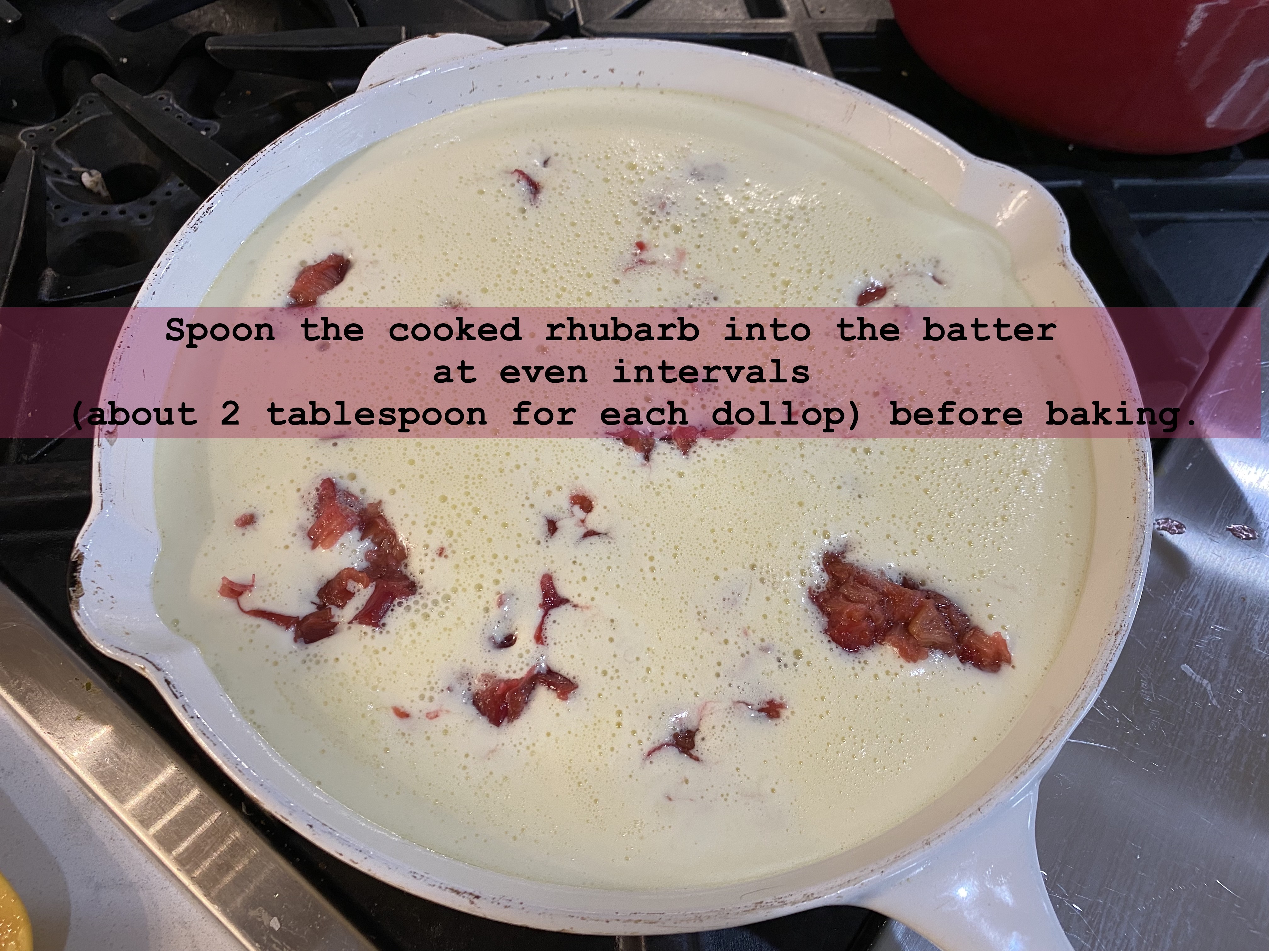 Next, mix or blend up the batter, pour it into a warmed pan, and then drop big spoonfuls of rhubarb around evenly into the batter: