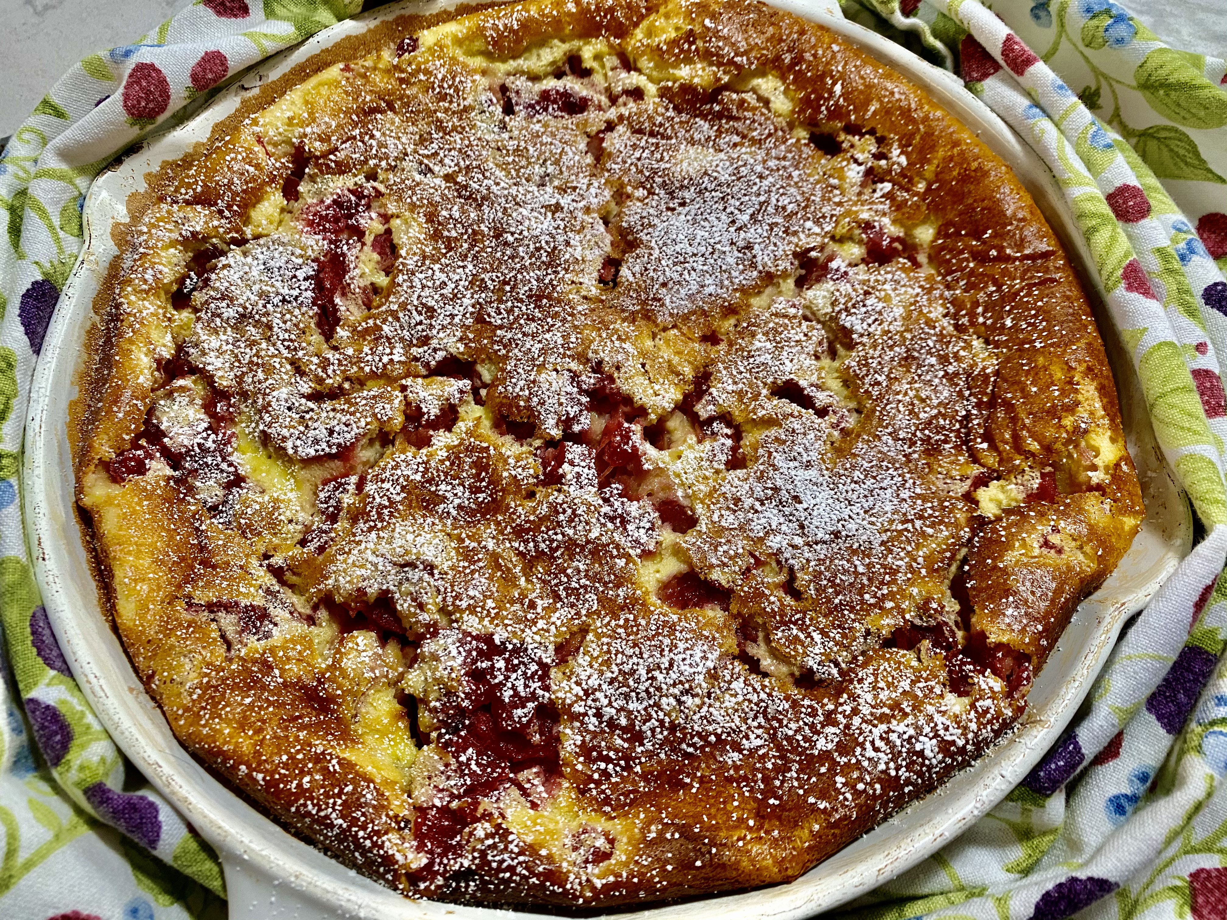 While this sweet might be among the more difficult dessert names to pronounce, it’s also the simplest to make and make well. Clafoutis (clah-FOO-tee) —and yes, I must keep remembering it’s a singular noun! — is a much-loved and often-baked traditional French dessert that is a cross between a custard and a cake, but easier and faster to make than either one. When cherries (or raspberries, blueberries…) are in season and hence plentiful-cheap, the oven is heated along with a cast iron pan (can also use a casserole), a quick batter is whirred together in the food processor, blender, or by hand and poured right into that the pan. The fruit gets distributed on top and into a HOT oven it all goes for just a half hour or so. And there’s dessert, friends. At first it’s all hot and puffy golden brown if you like it that way (think Dutch Baby), but soon it calms and cools down and is just as good, if a tad deflated. Cold for breakfast the next morning? Of course. Bien sur!