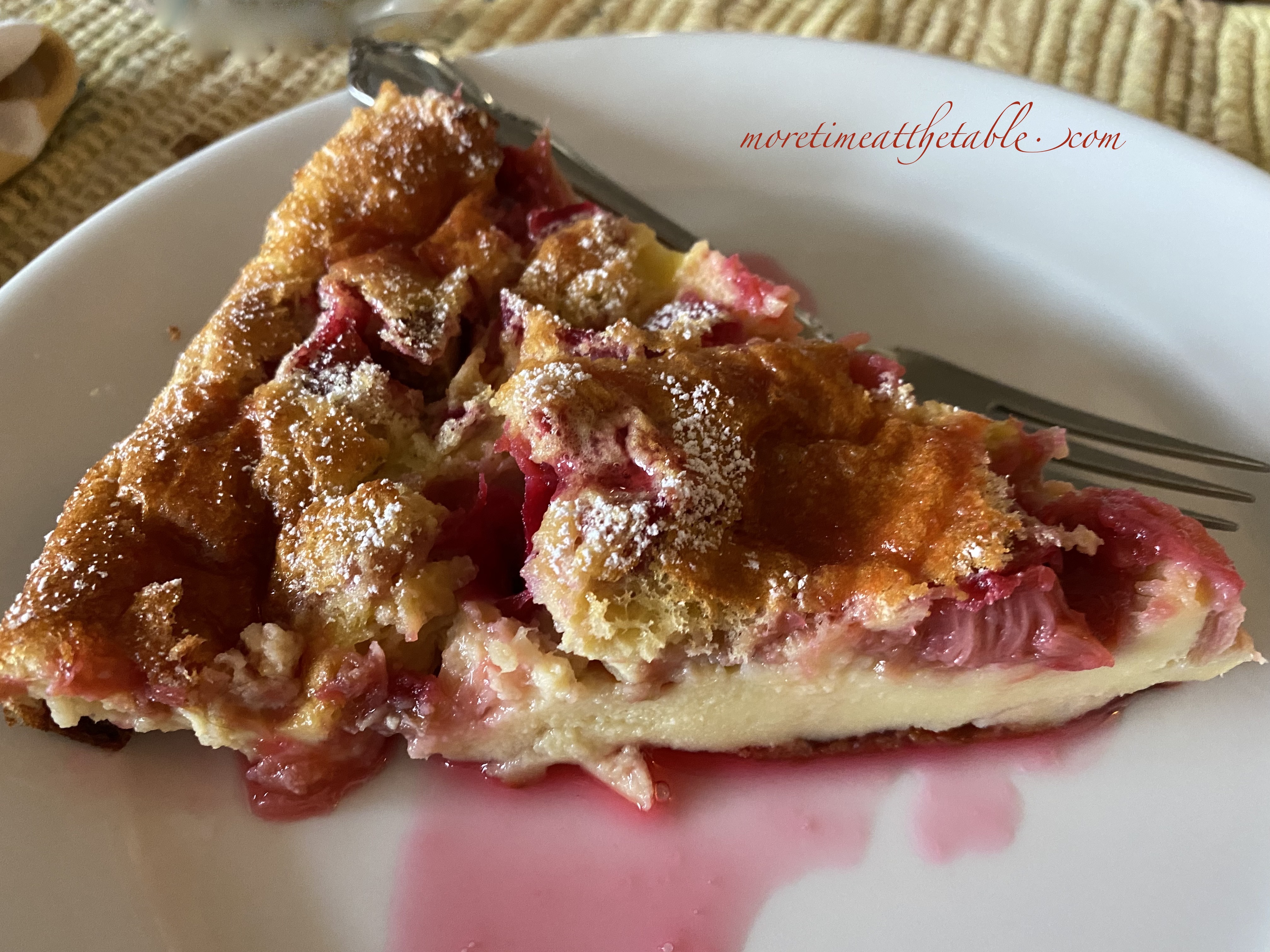 - BAKE THE CLAFOUTIS/SERVE WITH DRIZZLED RHUBARB SYRUP: Bake for about 30 minutes or until quite golden brown and puffed. Let cool a few minutes and then dust with powdered sugar. Slice and serve hot, warm, at room temperature, or cold with a drizzle of the reserved rhubarb syrup.