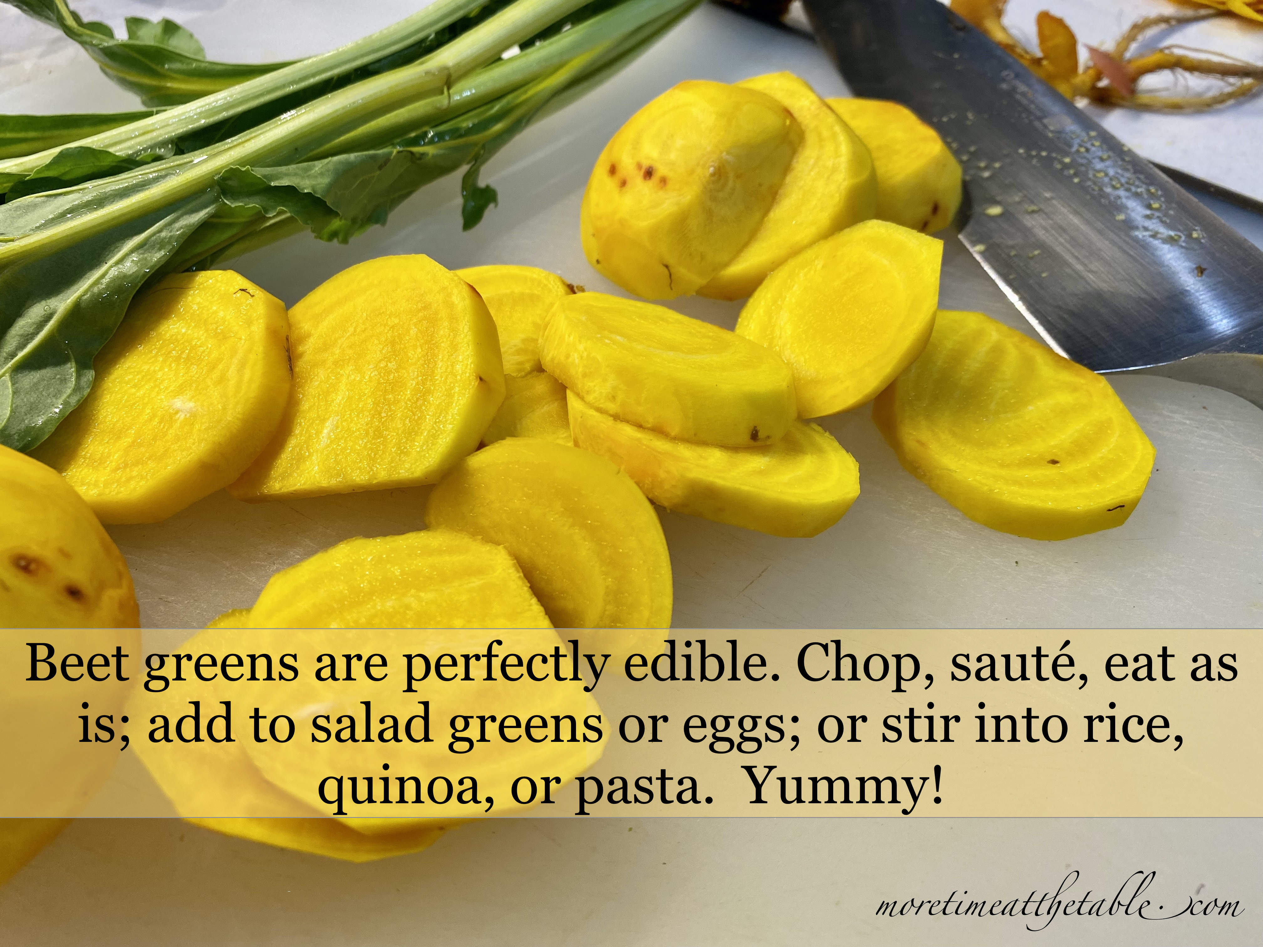 - As noted above, sauté the chopped beet greens and stems to add to this salad, to another salad, into scrambled eggs, etc. They don’t keep real long, so deal with them quickly, but don’t waste them. They’re good food.