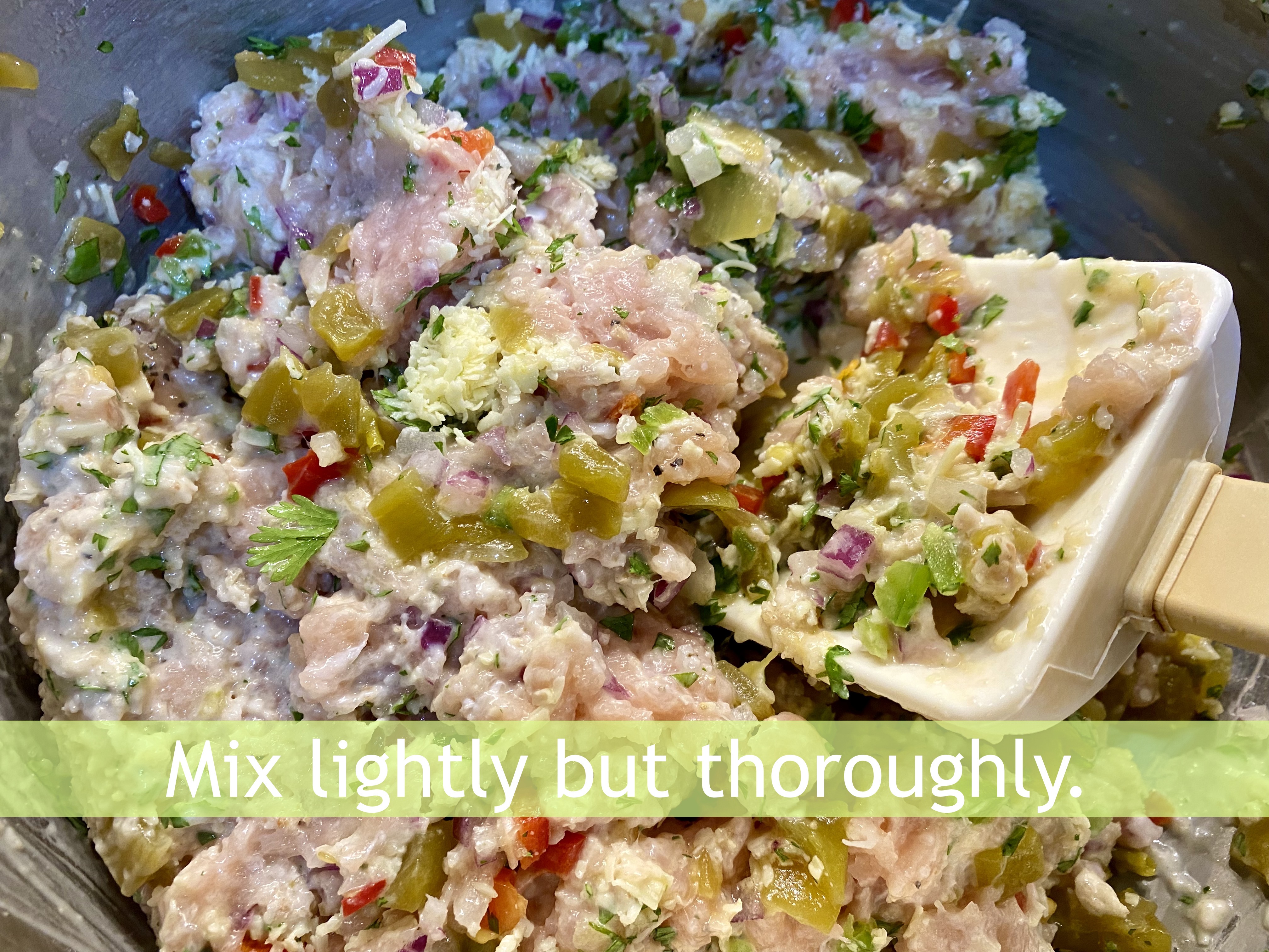 - In a large bowl, gently stir together the chicken, salt and pepper, chiles, jalapeño, red pepper, cilantro and red onion, grated Cheddar cheese, and garlic. Add the reserved mayonnaise mixture and stir together until just mixed. Do not overmix.