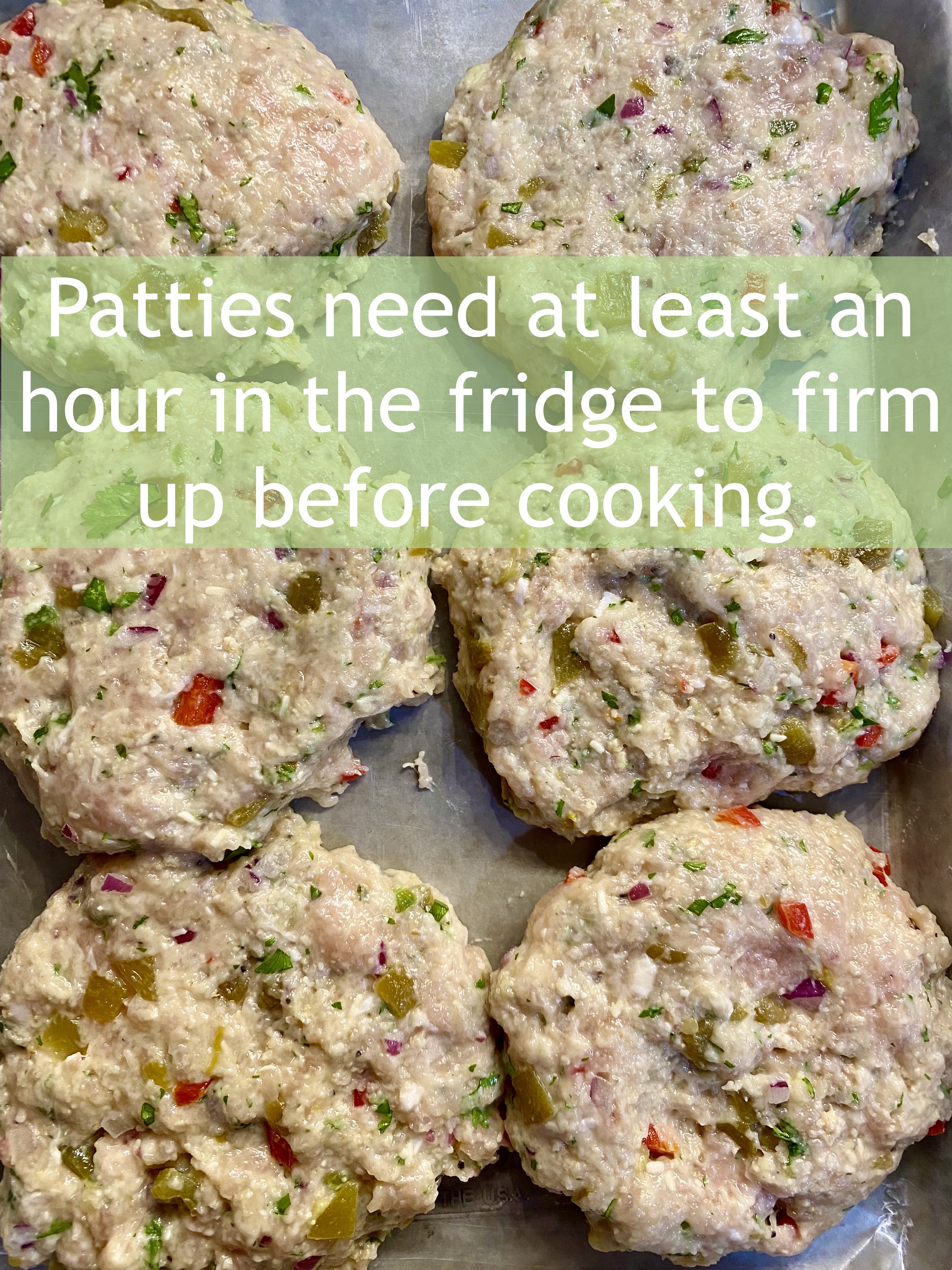 Ground lean chicken is bland, bland. I started thinking onion, garlic, bell peppers, chili powder, cumin, hot sauce, Cheddar, cilantro, jalapeño, salt, pepper… That was simply too much. Best to cut it down to the most needed, but easily available basics like s/p, onion, cilantro, jalapeño, finely grated Cheddar, and so on, which I soon did. And while the list appears lengthy still, most of these things are seasonings and easily managed. You will have to start about two hours ahead of dinner time (or even the night before), not because the burgers are difficult or time-consuming to make, but because once you’ve gotten the meat mixture together and formed the patties, they’ll need to rest in the fridge for an hour. It’s a tish inconvenient, but I promise you won’t be sorry because these chicken burgers are worth all sixty minutes of it. Try this: