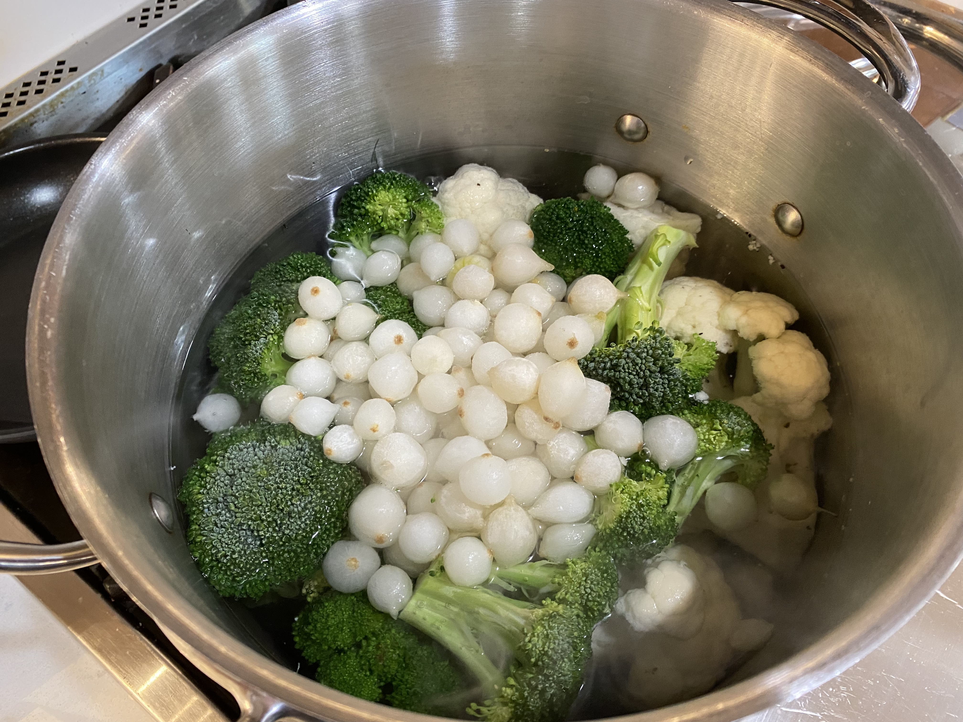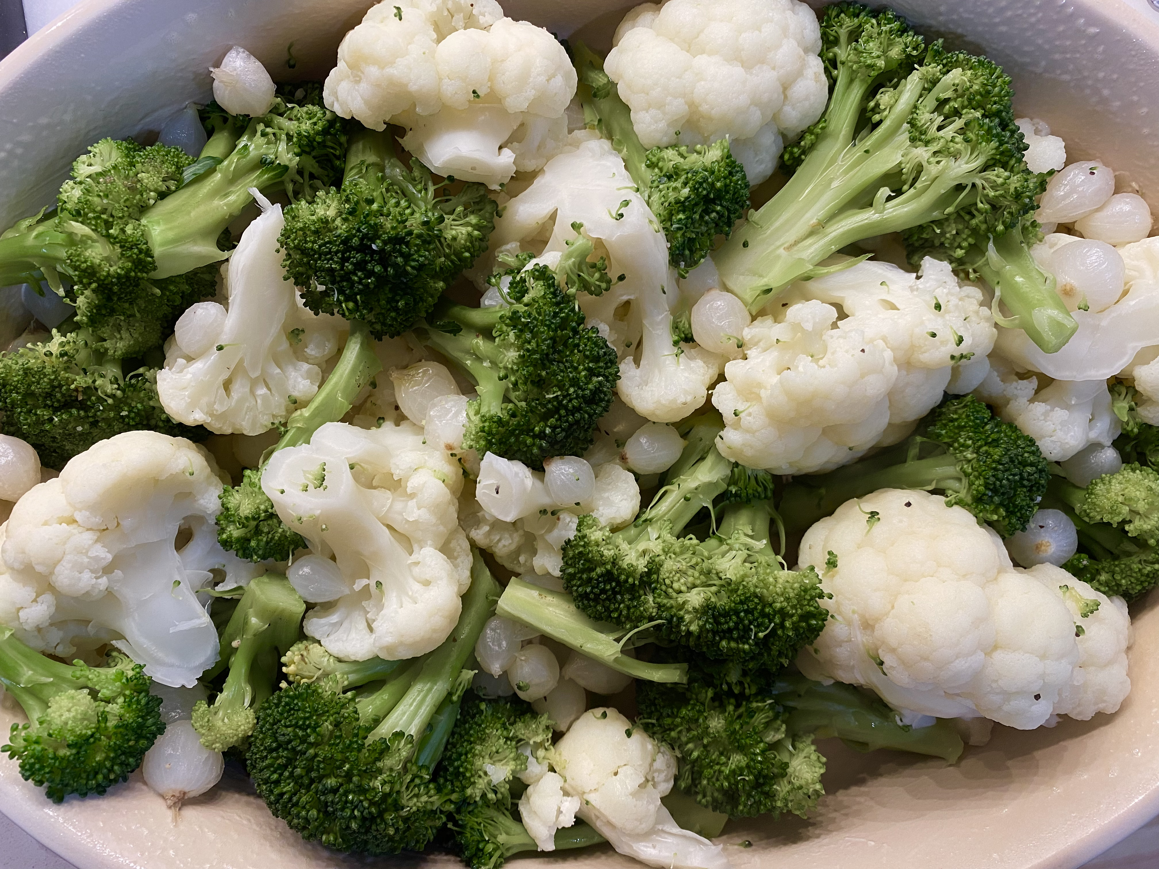 - COOK THE BROCCOLI, CAULIFLOWER, AND ONIONS: Bring a large pot of well-salted and peppered water to boil; add the broccoli, cauliflower, and onions. Reduce heat and cook at a low boil, stirring occasionally, until vegetables are nearly tender – between 5 and 10 minutes. Drain well and pour into the greased casserole dish. Set aside.