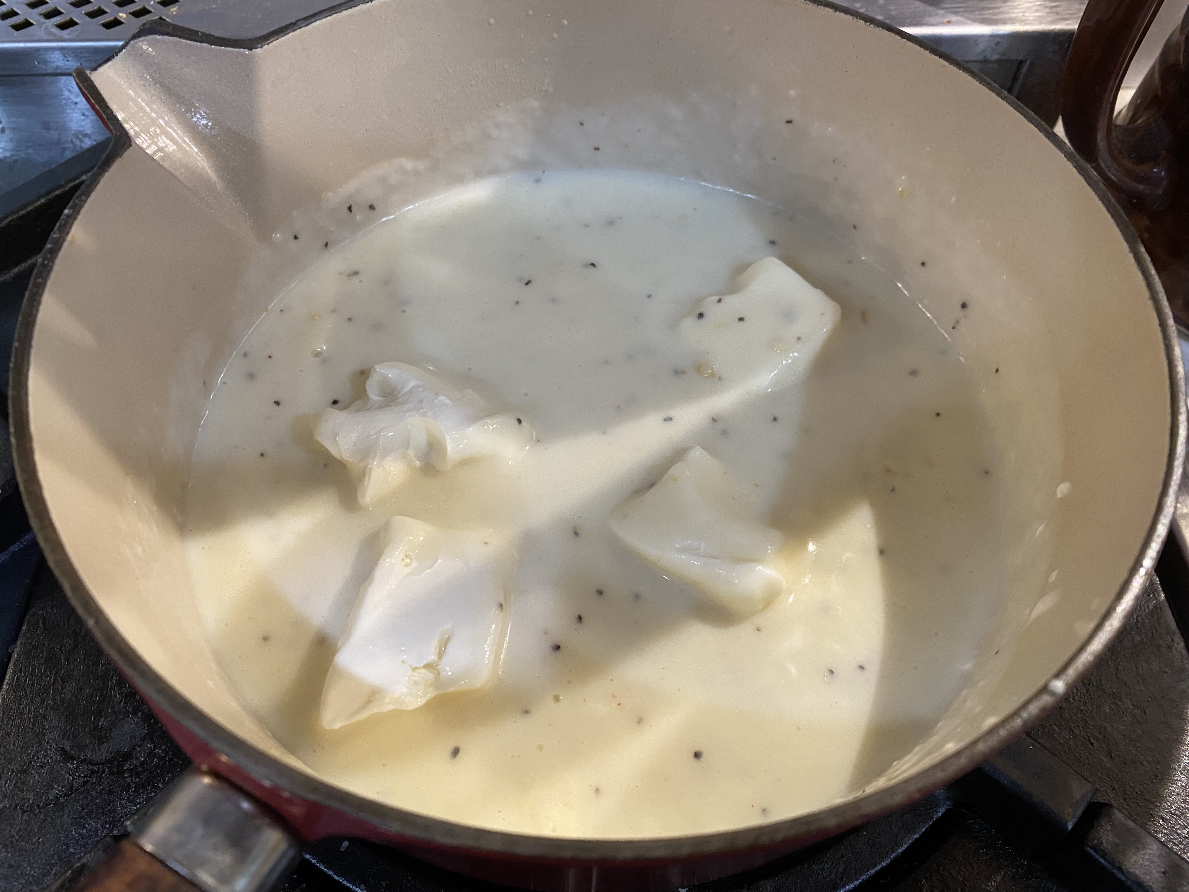 - MAKE THE GARLIC CREAM SAUCE: In a small cup, stir together the 2 tablespoons of flour, ½ teaspoon salt, ¼ teaspoon pepper, and the 1/8 teaspoon ground cayenne. Set aside. Melt 4 tablespoons of the butter in a 2 or 3-quart saucepan over medium heat. Add garlic and cook, stirring, for a minute. Whisk in the flour mixture and cook a minute or two to make a light roux. Whisk the warm milk in slowly and cook until thickened, continually whisking. Remove from heat and add the pieces of cream cheese. Cover for a few minutes. Whisk until smooth.