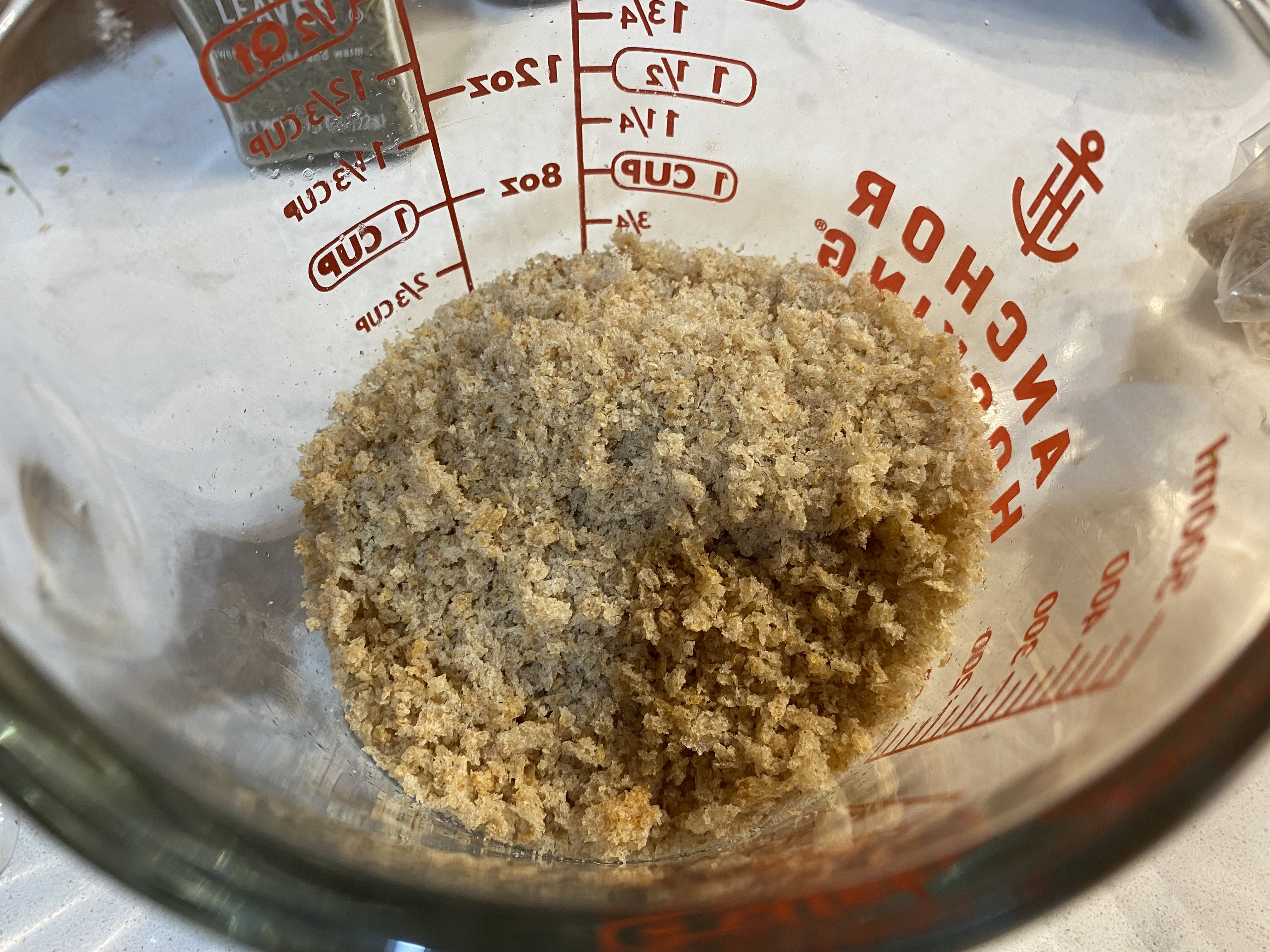 - 1 cup soft breadcrumbs (I like whole wheat.)