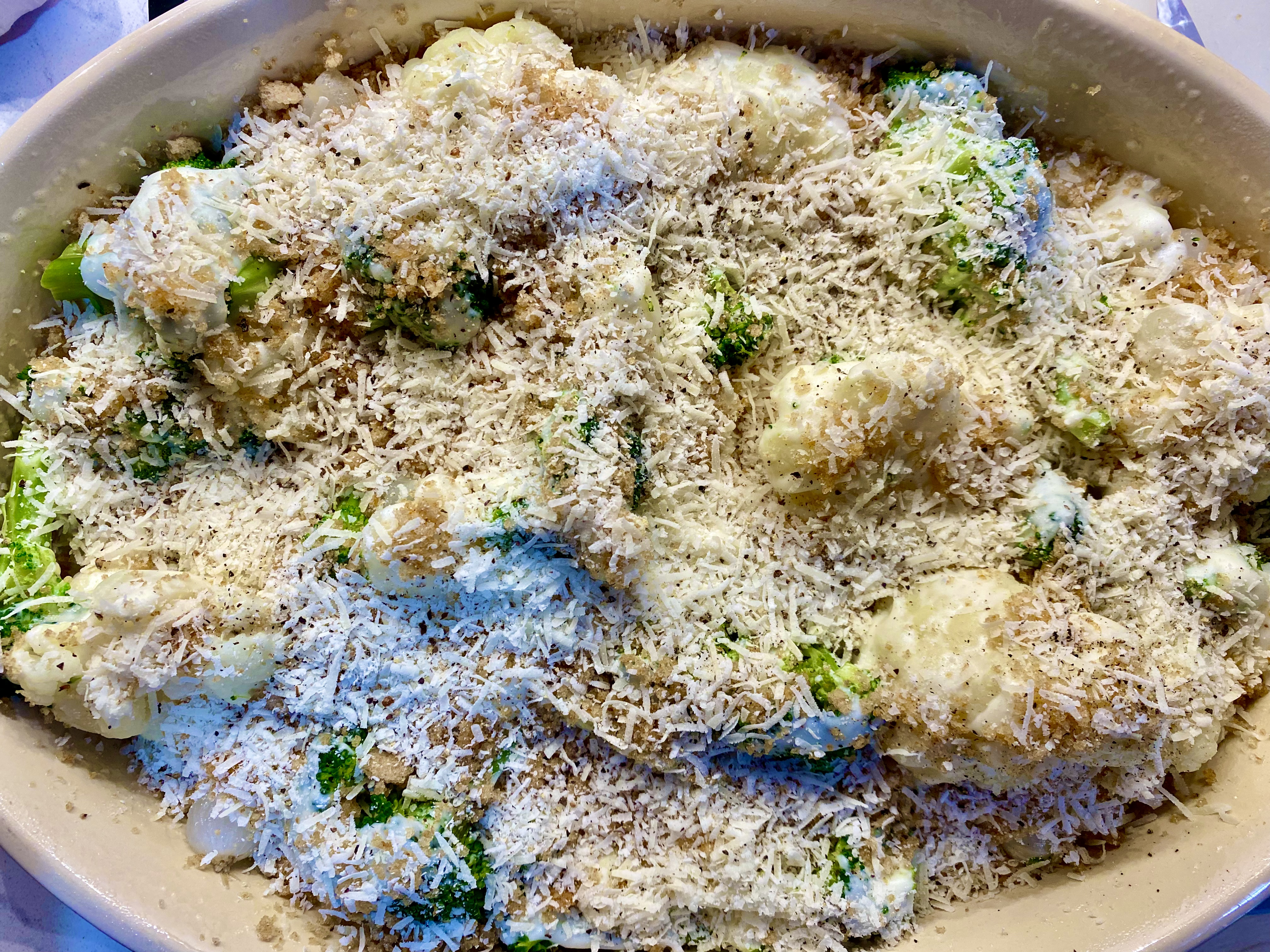 - ADD THE SAUCE TO THE VEGETABLES/TOP WITH BREADCRUMBS, CHEESE, AND PEPPER/ BAKE/SERVE. Pour the sauce evenly over the vegetables in the casserole dish and mix lightly. Mix the melted tablespoon of butter into the breadcrumbs and sprinkle on top of the vegetables. Sprinkle with the Parmigiano-Reggiano and a few last grinds of pepper. Bake 30 minutes or until hot, bubbly, and crispy at edges. Serve hot or warm.Store leftovers well-wrapped for 3 days in the refrigerator. Do not freeze.