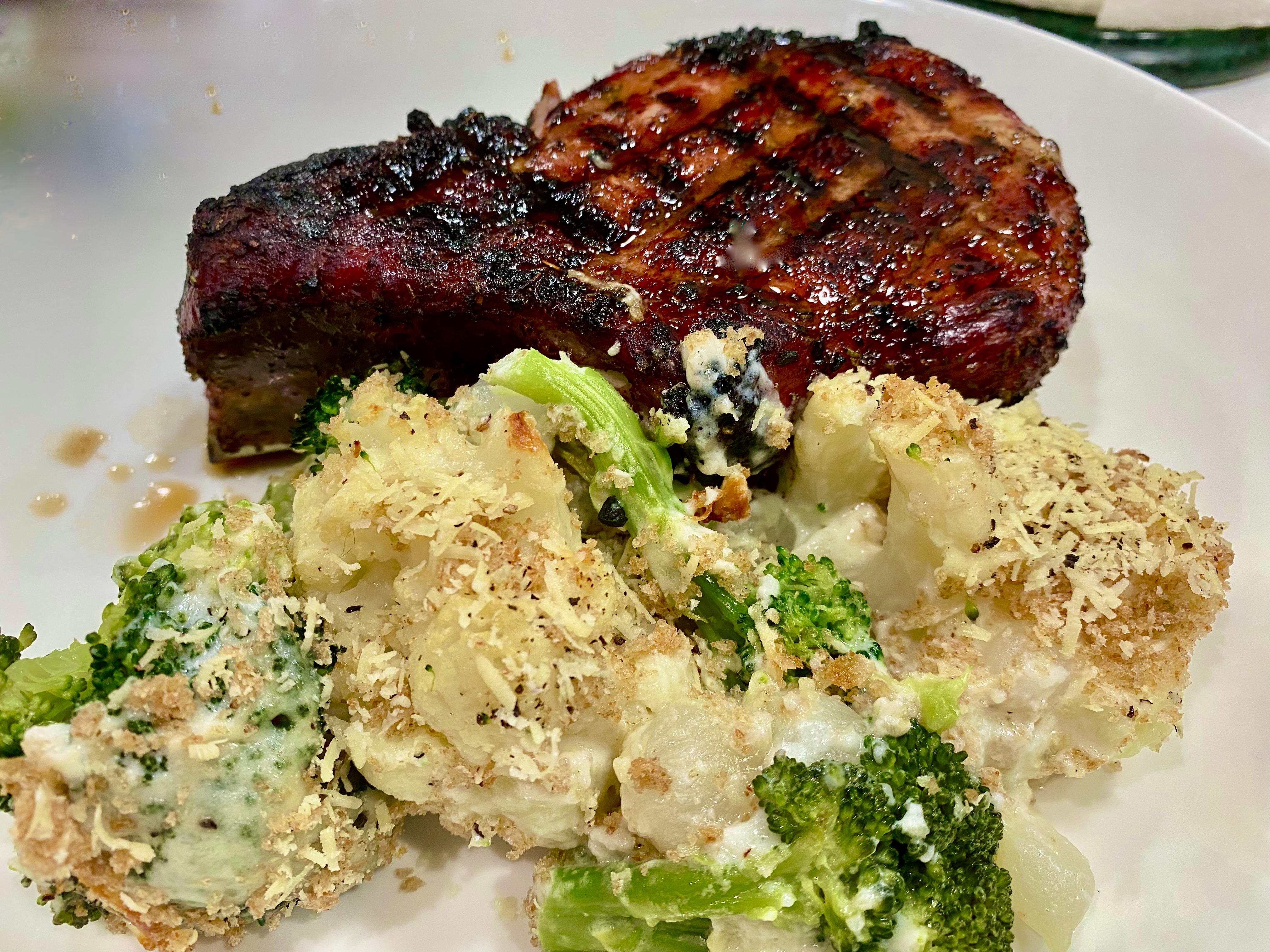 This year, looking for recipes to take along on a trip where we’ll make Thanksgiving in an airbnb (what will be in that kitchen?!), I came across an old sooooo cheesy broccoli casserole I barely remembered, but there’s a note on it that reads, “Thanksgiving staple.” And the more I thought about it, the more it rang a bell. Just for fun, I’d make one ahead to see what I thought and whether it really might work for this year. Reading the recipe over a few times, I began to make changes in my head. With one exception, I had all of the ingredients I wanted in the house — a real boon. Broccoli turned into broccoli AND cauliflower. A creamy sauce ramped up to one laced with not too much, but a certain amount of perky garlic and even some ground cayenne for a soft punch. The ubiquitous yellow Cheddar was replaced with a much lesser amount of silky-salty Parmigiano-Reggiano, and so on. I made it to accompany humongous pork chops Dave first smoked on the Traeger and then seared on our gas grill and, after two big helpings, Dave asked, “Why would we have anything else this Thanksgiving?” While it’s much like other veggie casseroles most cooks make this time of year, we found it a total upgrade and the flavors are smack on. And so it will be part of our smaller meal this year, cozying up to a charcoal grilled turkey breast and some whole roasted sweet potatoes. Of course the pumpkin pie is along for the ride. I’ve got the recipe, a pie plate, a pastry cutter, a whisk, the rolling pin, two cans of pumpkin (I need last year’s pumpkin, you see–it makes the best pie), and my spices all packed in their own special suitcase ready to hit the road at 6:30 tomorrow morning. Where I go, the pie follows.
