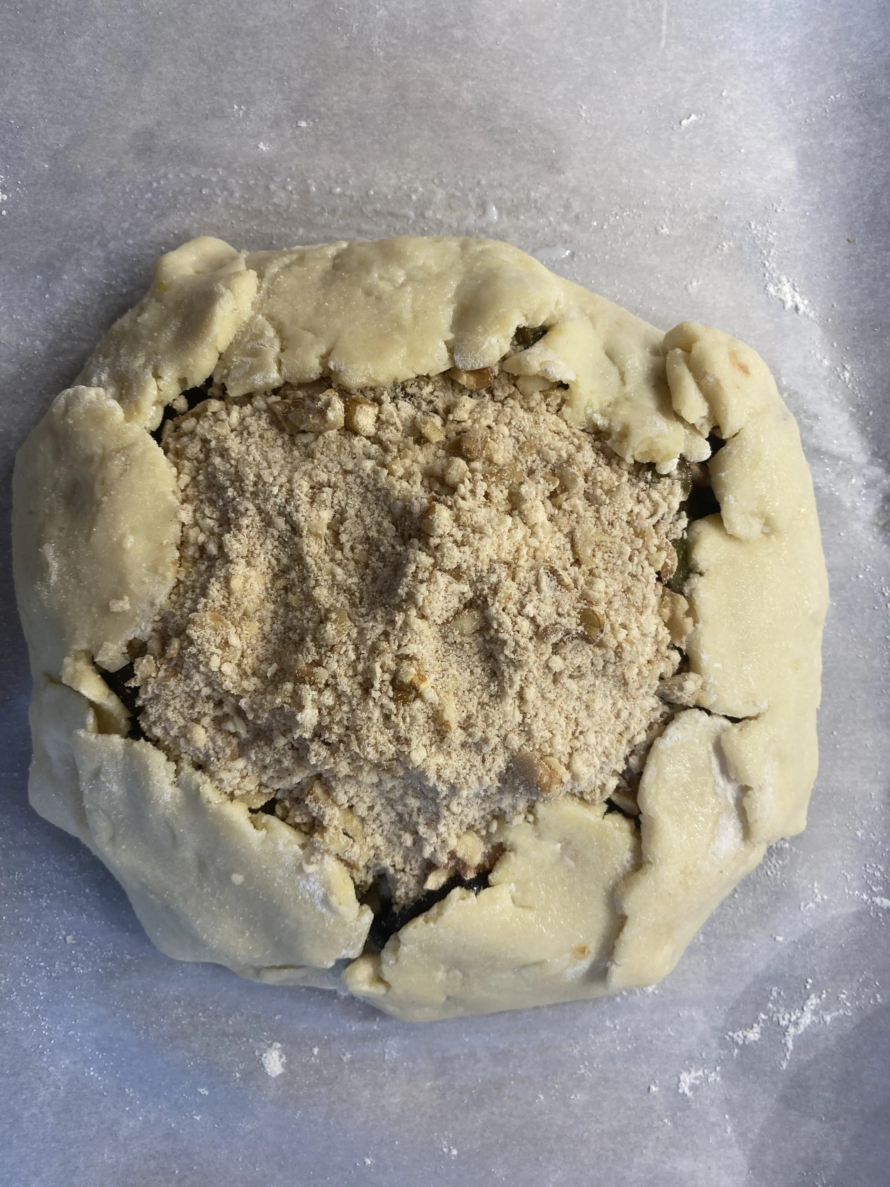 - ROLL OUT DOUGH: Sprinkle the counter or board lightly with flour. Roll out the chilled pastry dough into an 11-inch round, lifting/turning dough and dusting counter again once or twice to keep dough from sticking. Roll the dough up onto the rolling pin (or carefully fold it into fourths) and move the dough to the center of the parchment-lined rimmed baking sheet.