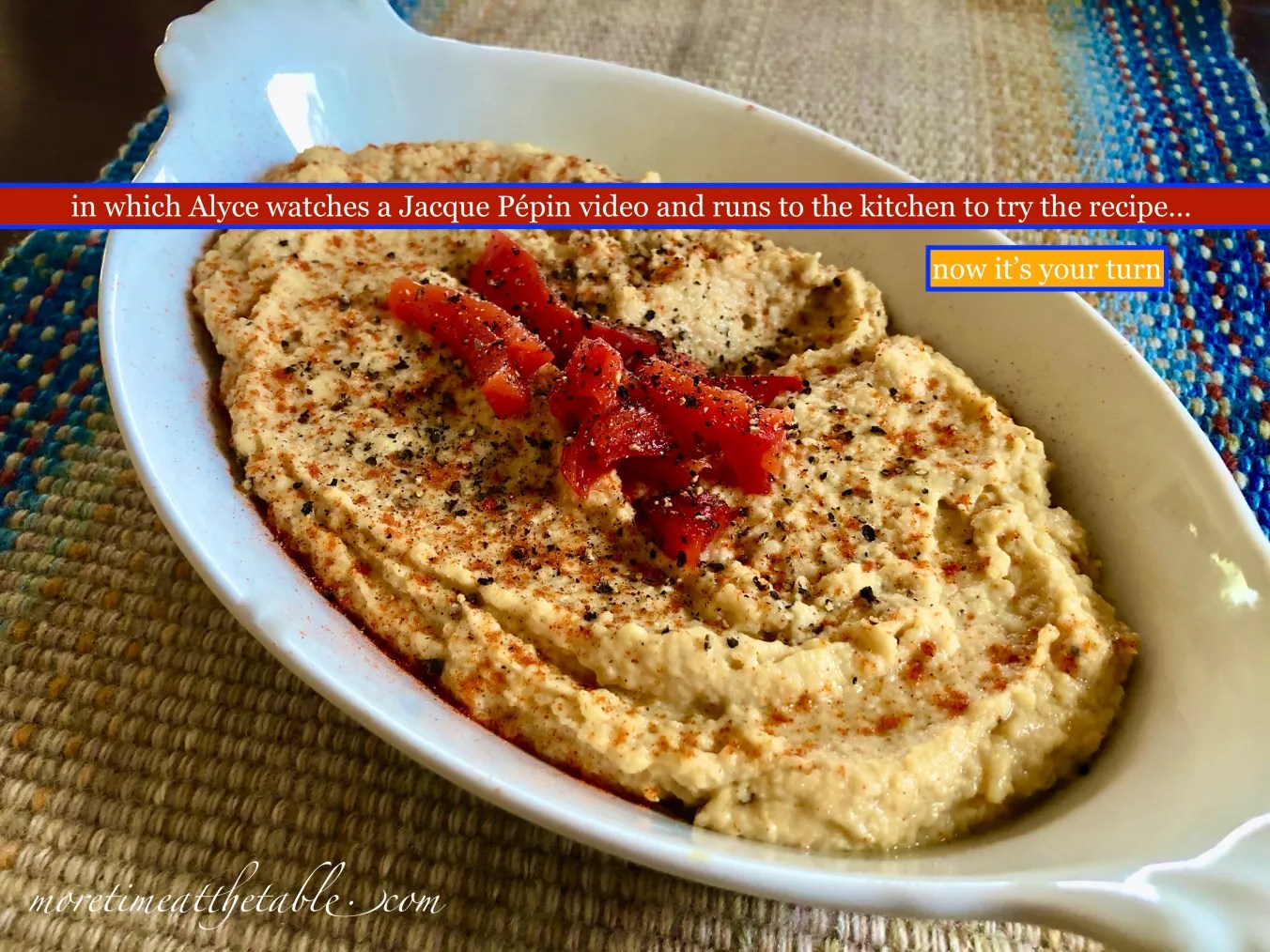My Salsa-Black Bean Dip method relies heavily on Jacques Pépin’s basic hummus (many thanks to my hero), but leans southwest using no-salt black beans, salsa (homemade or jarred), chili powder, ground cumin, lime juice, and so on. Healthy olive oil stands in for the sometimes used sour cream and the whole thing is ready to be served in minutes. I grant you, the chopping of the garnishes takes a teensy bit of time, but you can simplify that by using only slivered green onions and cilantro or, if you’re really out of time, grinding some black pepper right in the center and calling it ready-to-eat. As it stands, the recipe provides a vegan/vegetarian, dairy-free, gluten-free (read labels for all purchased ingredients) treat but if you like you can certainly add grated Cheddar or crumbled Cotija cheese or maybe even dollop a tiny little sour cream on top if you’re feeling particularly skinny that day.