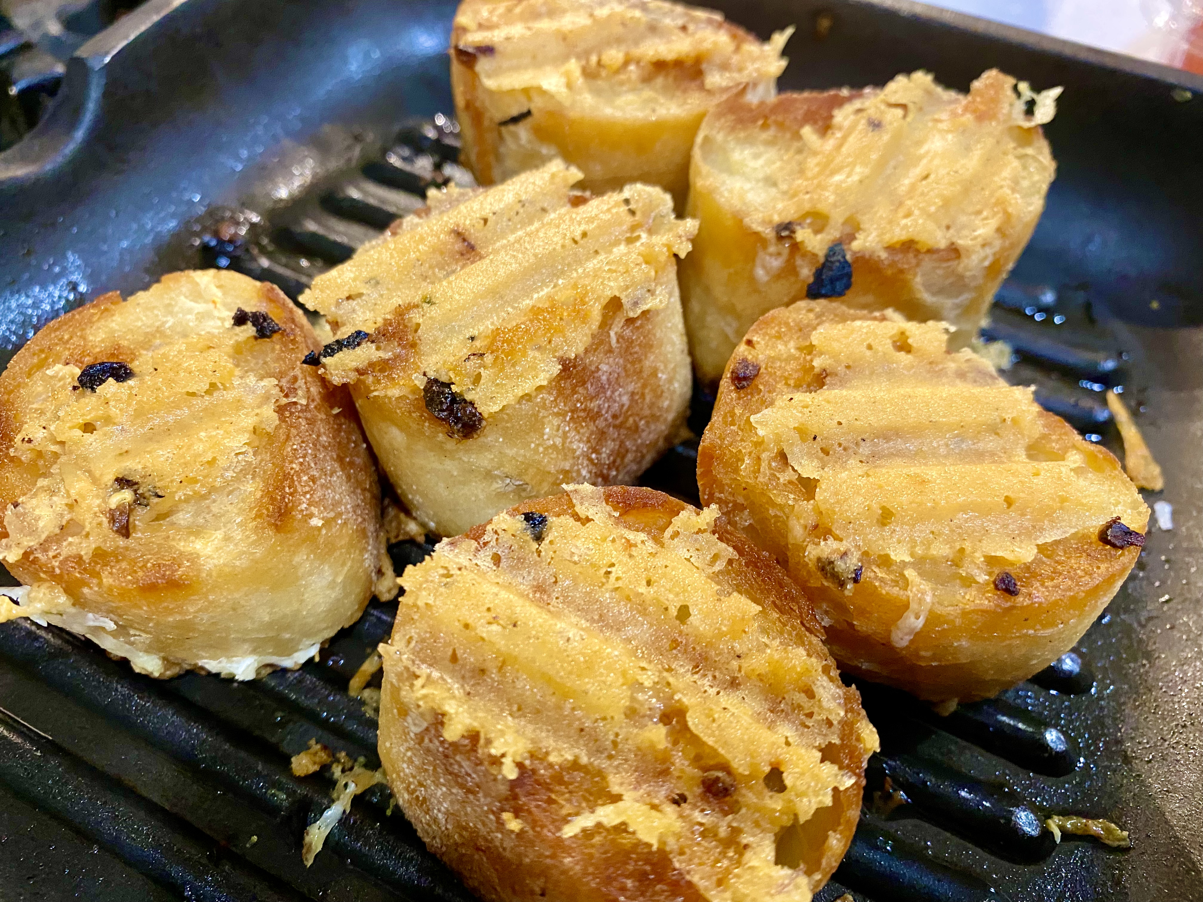 - For even BETTER grilled bread (I know), you’d do all that and ADD GRATED CHEESE after the bread was grilled and hot. When the cheese was softened, you’d turn it over and grill the cheese. And….repeat with the other side so that, yes, both sides are cheesy-crispy. No, the cheese won’t stick. If a little or more than a little gets on the grill pan, it’ll crisp up to perfection and you’ll eat that, too. And that’s my CHEESE BREAD. I do make it without the garlic just as often or maybe more often.