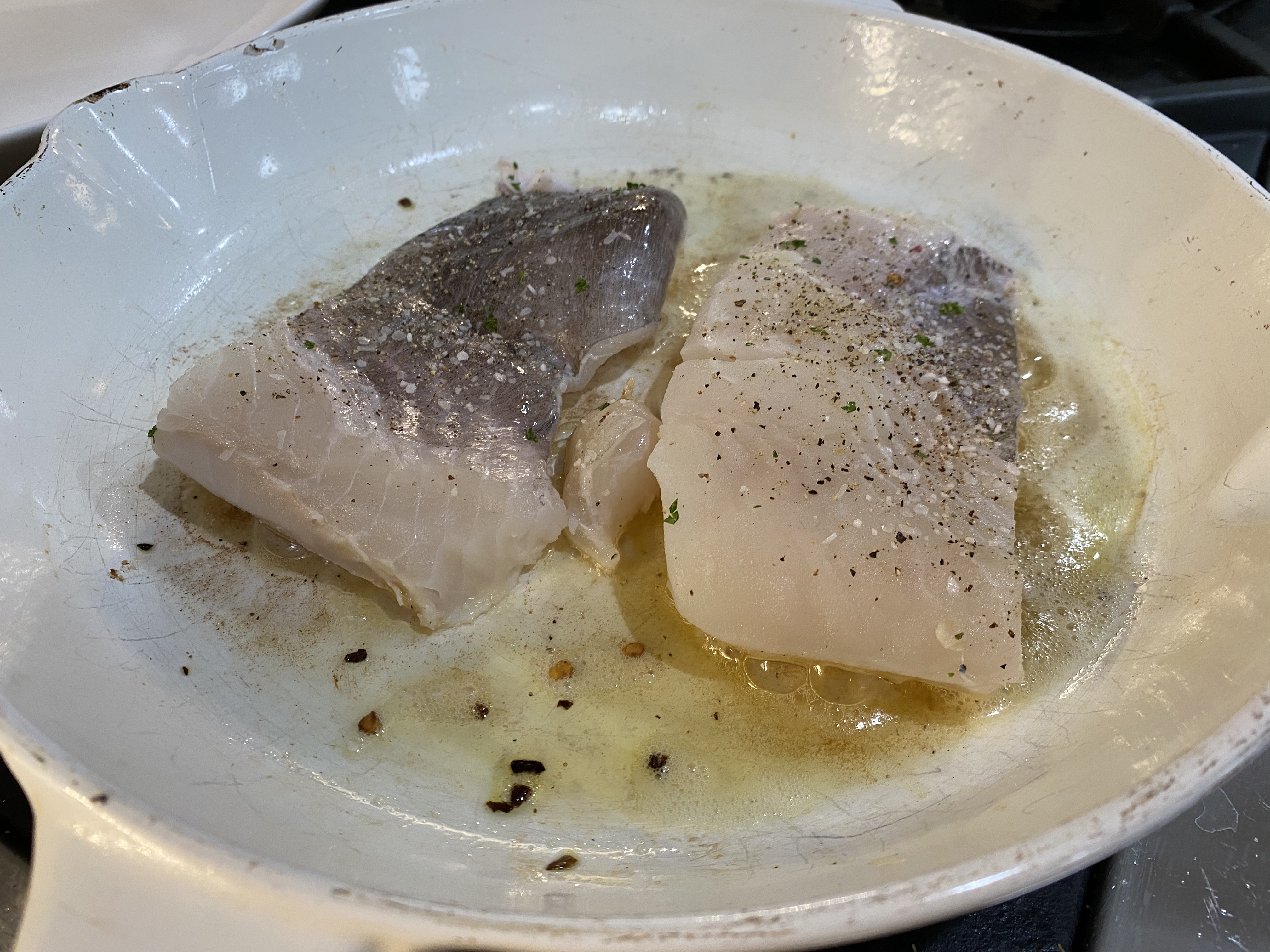 - COOK FISH: Heat the oil, butter, and crushed red pepper in a medium flat heavy skillet over medium-high heat until butter is melted and bubbling. Salt and pepper both sides of the fish, patting spices in with your fingers, and add to the skillet an inch or two apart. Let cook 3 minutes until browned; turn and cook the other side, 2-3 more minutes. Lower heat to medium and cook another minute or two OR until fish is nearly firm, opaque, but still moist. (If your fillets are thin, it will take less time. If they're thick, you'll need a bit more time. Fish will continue to cook after taken off the heat, so less is better.)